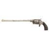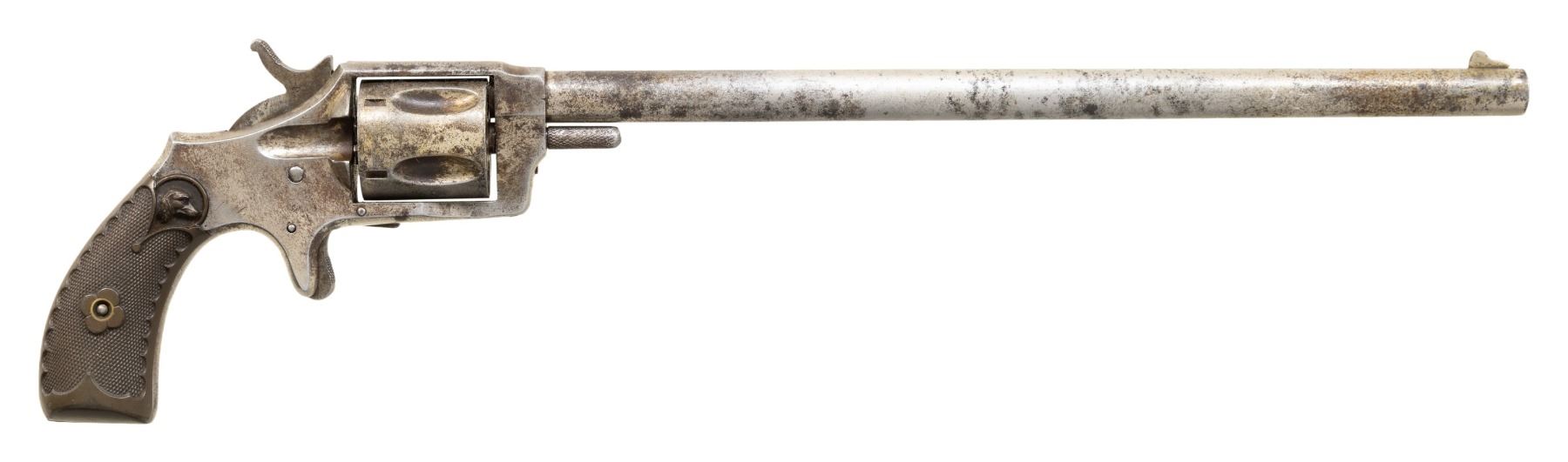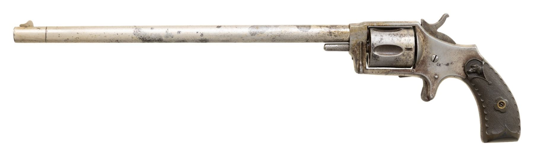 Cal. 32 CF. S# 217 (under grips). Mfg. approx 1880's-1890's by the Hopkins & Allen Company. This revolver appears to be based on the XL No. 3 revolver with 10" barrel. 5 Shot fluted cyl. Matching numbered two piece hard rubber grips w/ dog's head. Bottom of frame has 2 holes for stock. CONDITION: metal has gray patina appearance with lighting & deep scratch on barrel tip. Good grips. Fair pitted bore. Needs gunsmith attention; the cyl. periodically does not rotate when hammer is cocked. (01-28902/MD). ANTIQUE. $100-200.