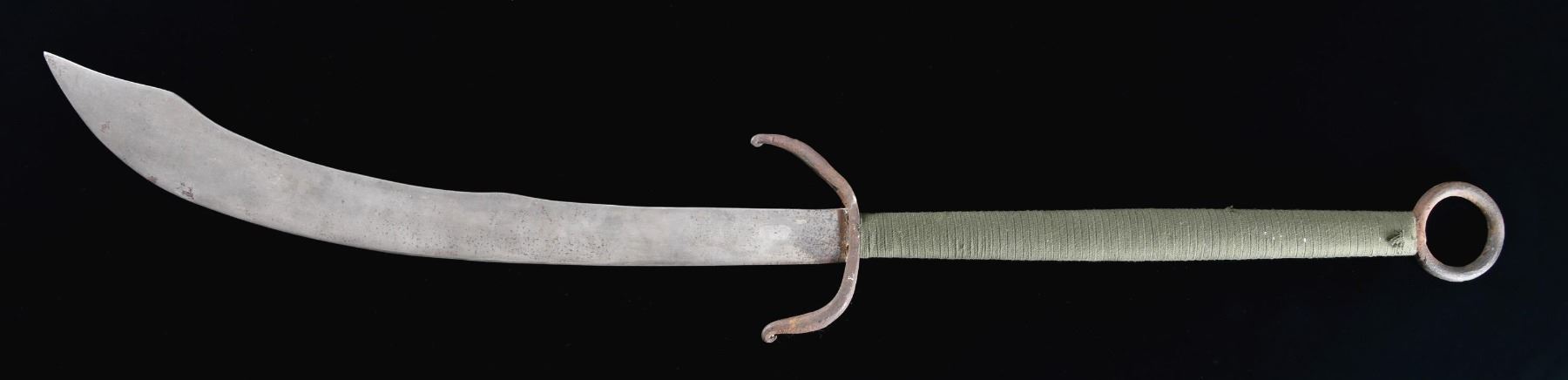 A seldom seen authentic example of a Chinese executioner's sword, likely dated to the early-to-mid-1800s. The overall length is 50 1/2" and the blade length is just over 28". The blade has a Damascus pattern throughout and some etched decoration is visible. The heavy iron, down-turned, guard measures 7" across with simple turned over quillons. The iron grip is wrapped in a 20th century olive green cotton flat cord. The pommel features a circular iron ring measuring 3 1/2" in diameter. CONDITION: the blade has a pleasing gray patina with minor staining. The blade does show significant use and likely ended the lives of many Chinese offenders or their enemies. The current cord wrapping the grip shows light wear. The guard and pommel ring have an oxidized patina. (02-23943/BF). $600-1,000.