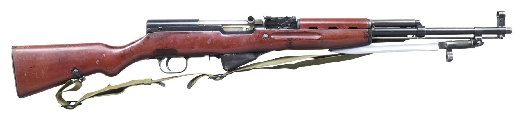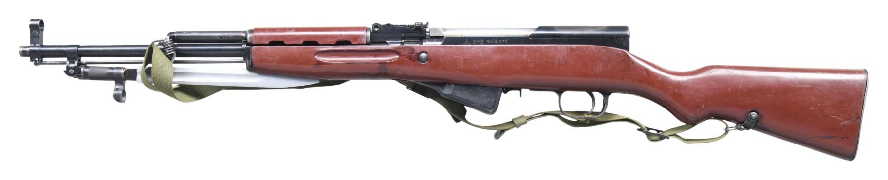 Cal. 7.62x39. S# 9018379. Serial number matches on receiver, bolt, receiver cover, magazine & trigger guard. Bbl. 20 1/2". Import marked at bottom of bbl. Tangent rear sight graduated to 1,000 meters. Post front sight w/ protective hood. 9 1/2" fullered folding bayonet. Cleaning rod is present. Synthetic stock & handguard. Stock manufactured in two pieces w/ lengthwise seam. Green web sling. UNATTACHED ACCESSORIES: cleaning kit in butt. CONDITION: stock set has moderate to heavy wear w/ scuffing & handling marks. Metal retains 60% of its original worn blue finish. Very good shiny bore. (25-2669/RW). MODERN. $300-500.