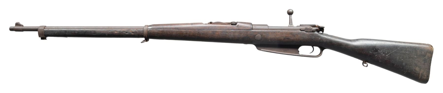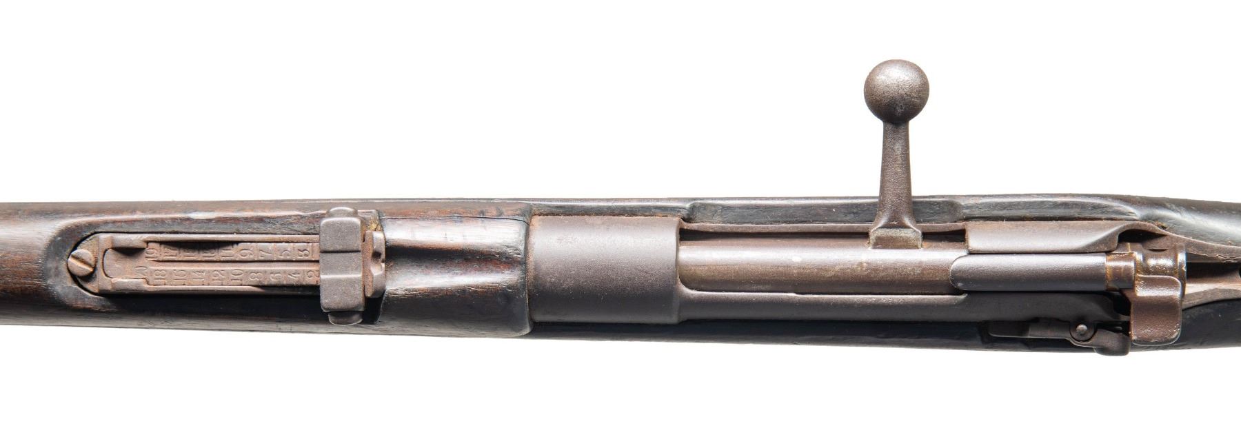 Cal. 8mm Mauser. S# 3I1148. Bbl. 29 1/4". Blade front sight. Tangent rear sight graduated to 2000m. Parts are unnumbered or mismatched. Receiver ring has no discernable markings. Asian hardwood stock with bottom mounted sling swivels. Right side of butt has varied Chinese roundels likely for schools or militias. No cleaning rod present. CONDITION: stock set has a darkened appearance with scattered cracks, chipping ,dings handling marks & scratches. Metal is a dull gray oxidized patina with scattered pitting. Safety not functioning & bolt has notable play but appears functional. Dark oxidized poor bore. (25-4397/MJC). CURIO. $150-250.