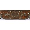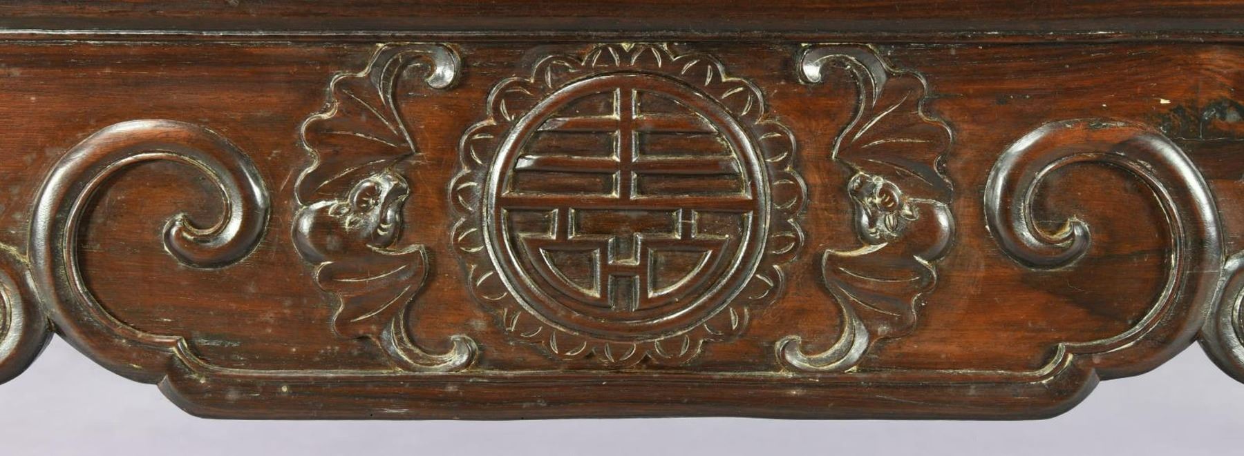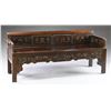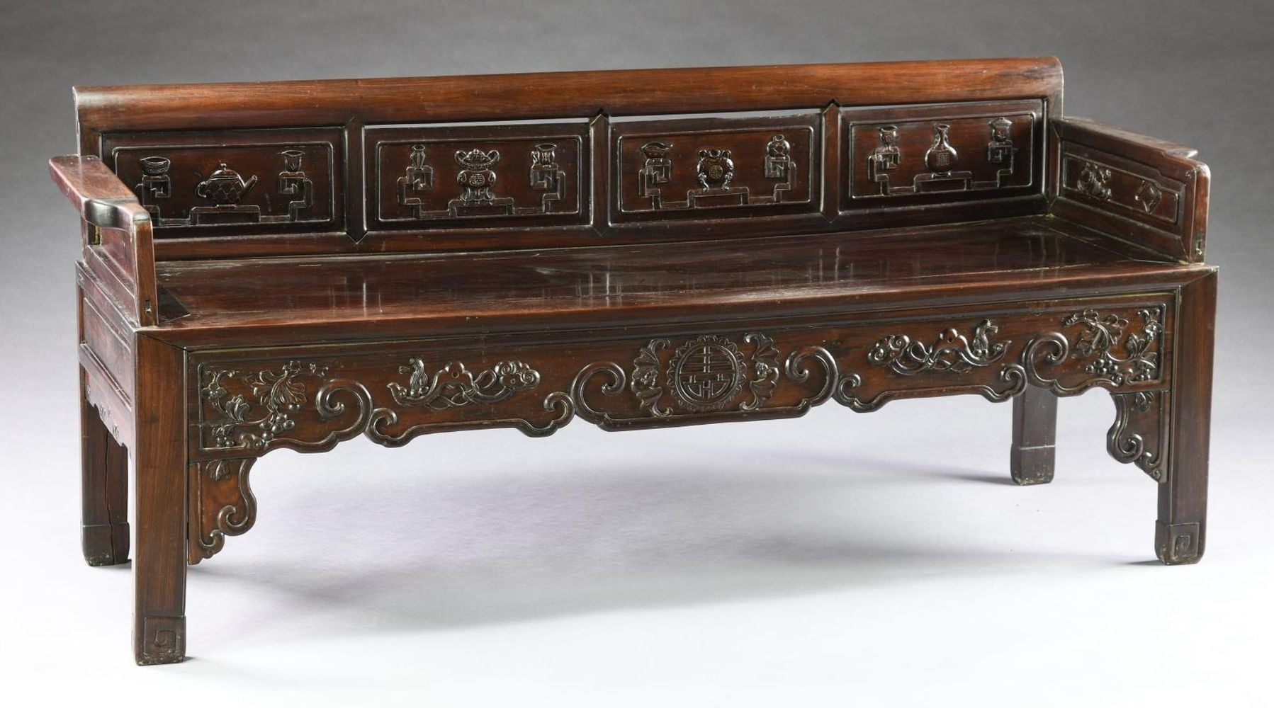 19th century, China. The rectangular four panel back carved with Symbols of Plenty joined to the horizontal arms, each with conforming panel above the plank seat above a foliate carved apron with scroll work molding centering a roundel with a calligraphy symbol. Raised on square legs with shaped returns. SIZE: 32" h x 74 1/2" l x 24" d. PROVENANCE: From the Estate of John Webber of Bangor, Maine. CONDITION: very good original surface. (05-804/TG). $800-1200.