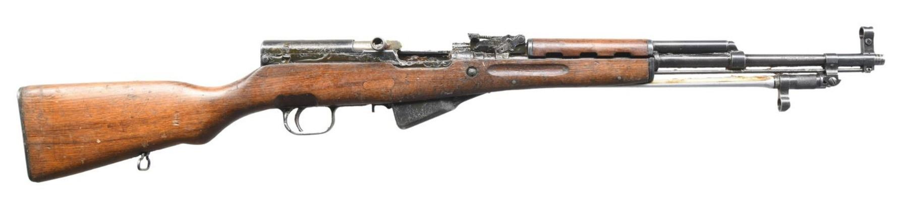 Cal. 7.62x39. S#11258534. All visible numbers match. Bbl. 20 1/8". Import marked on right side of bbl. Tangent rear sight graduated to 1,000 meters. Post front sight w/ protective hood. 12 1/4" folding spike bayonet. Cleaning rod is present. Hardwood stock set. CONDITION: rifle is heavily coated in preservative grease. Stock set shows considerable wear & staining w/ oval shaped inletted repair on right side behind mag. Metal retains 60% original finish w/ wear & handling marks. Very good shiny bore. (23-2707/RW). CURIO. $400-600.