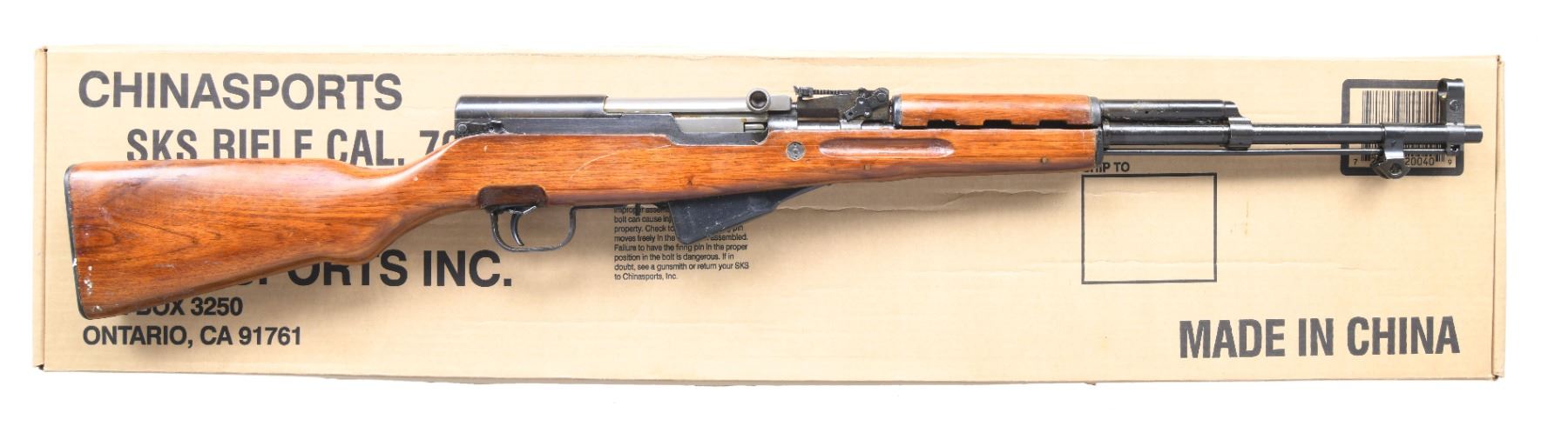 CARBINE. Cal. 7.62x39. S# R1703691; all visible numbers match. Bbl. 20 1/2". Receiver is marked on the left side with "26" in a triangle and three Chinese characters; it is also import-marked. Tangent rear sight graduated to 1000 meters. Post front sight with protective hood. Cleaning rod is present. Bayonet is not present. Hardwood stock set. UNATTACHED ACCESSORIES: cleaning kit in the butt. Matching shipping box contains green web sling, 10-pouch canvas ammunition carrier, oiler, and an instruction manual. CONDITION: stock set has light wear and scattered handling marks. Metal retains 90% of its original finish, with light high-point wear. Near-excellent, shiny bore. PROVENANCE: the Estate Collection of Charles Wagner. (24-4669/RW). CURIO. $350-500.