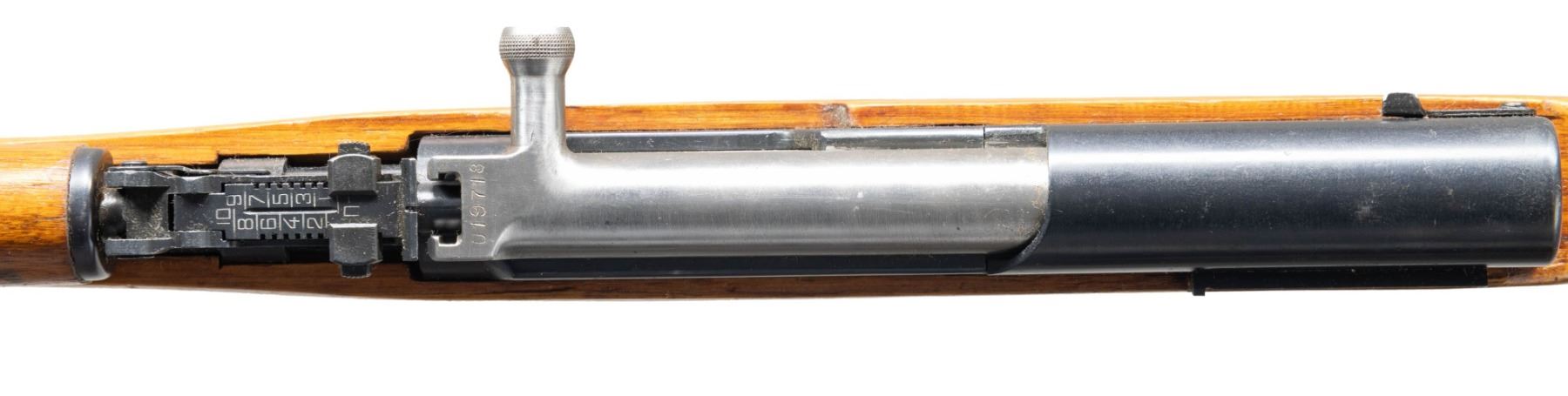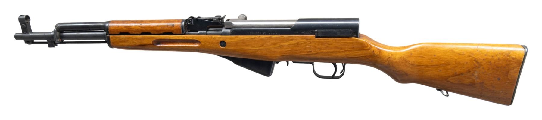 Cal. 7.62x39. S# 019718. Bbl. 16 1/2". Post front sight with hood. Tangent rear sight graduated to 1000m. Matching numbers on receiver, bolt, top cover, trigger guard & mag. Stock appears unnumbered. Left side of receiver has Navy Arms import marking & boxed "0223" factory marking. Receiver also has scope mount provision on left side. Blued finish. Asian hardwood stock with both left side & bottom sling provisions. No bayonet assembly present & stock lacks cut for bayonet. Cleaning rod present. CONDITION: stock set has arsenal type finish with some staining mostly on butt, a few dings & scattered handling marks. Metal retains 85% blue with scattered oxidation along the edges, edge & handling wear. Action functions properly when hand cycled. Very good plus bright bore. (25-3093/MJC). MODERN. $200-400.