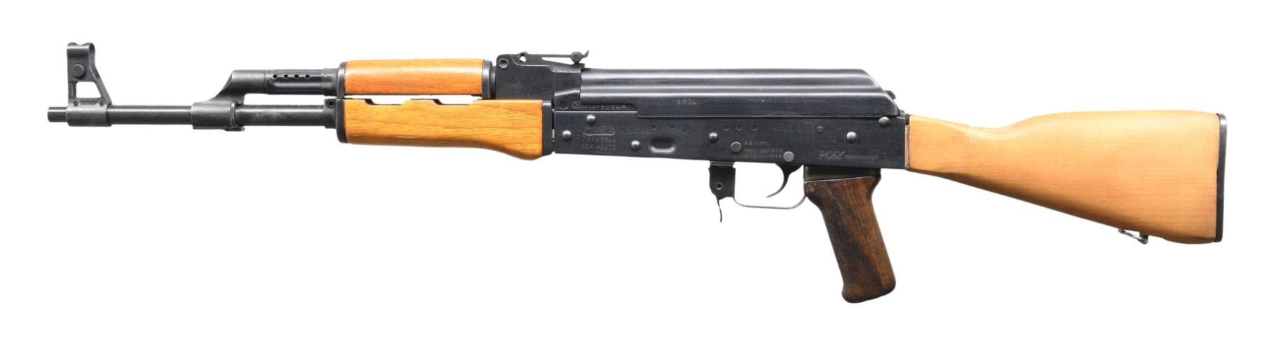 Cal. 7.62x39mm. S# CS-9084A. Bbl. 16 1/4". MAK-90 semi-automatic rifle, mfg. in China at Factory 386 and imported by K.B.I. Inc. Left side of the receiver is faintly marked "MAK-90" within a milled panel above "7.62x39mm/ SEMI-AUTO", followed by K.B.I.'s importer information and "POLY TECHNOLOGIES". Metal components exhibit a blue finish overall. Original Chinese wood handguard, with replacement buttstock (appearing to be of Serbian mfg.) and plain wood pistol grip. Bolt carrier also appears to be of Serbian mfg. Matching numbers are present on the receiver, receiver cover, bolt, and upper handguard. Mag. is absent. CONDITION: metal components retain the majority of their original factory finishes, exhibiting some oxidation and pitting on the bbl. and buttplate, with scattered superficial handling marks present overall. Mirror chrome-lined bore, exhibiting well-defined rifling throughout. Wood furniture exhibits scattered marks and minor impressions from handling and storage but otherwise remains sturdy and serviceable. (24-5386/MLW). MODERN. $800-1,200.