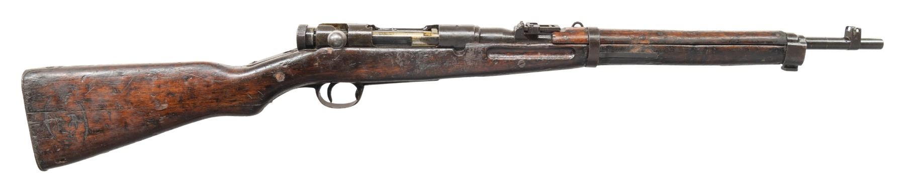 CARBINE. Cal. 7.62x39. S# 151250. Bbl. 29" with Oyster Bay import marking. Standard T38 carbine sights. Mismatched numbers throughout. Post war Chinese converted T38 carbine to 7.62x39. Receiver ring has faint but intact mum & T38 markings. Left side of receiver has Tokyo arsenal marking & serial. Arsenal blue finish. Asian hardwood stock set with left side sling swivels & faint Communist brand on right side of butt. No cleaning rod present. CONDITION: stock has heavily worn appearance with a few crossbolt repairs, an 8 1/2" crack on underside of forend, overall heavy finish wear, a long crack running from back of upper tang into rear of comb, scattered staining, chips, further cracks, gouges, dings & handling marks. Metal is an overall dull gray color with cosmoline remnants, scattered oxidation, pitting, dried grease, edge wear & traces of bluing. Safety not engaging but action otherwise is functional when hand cycled. Bore shows scattered pitting & dried grease but evident rifling. (25-6265/MJC). CURIO. $200-300.