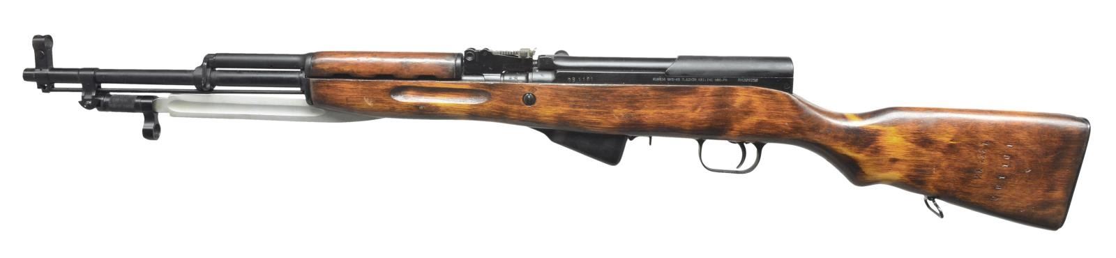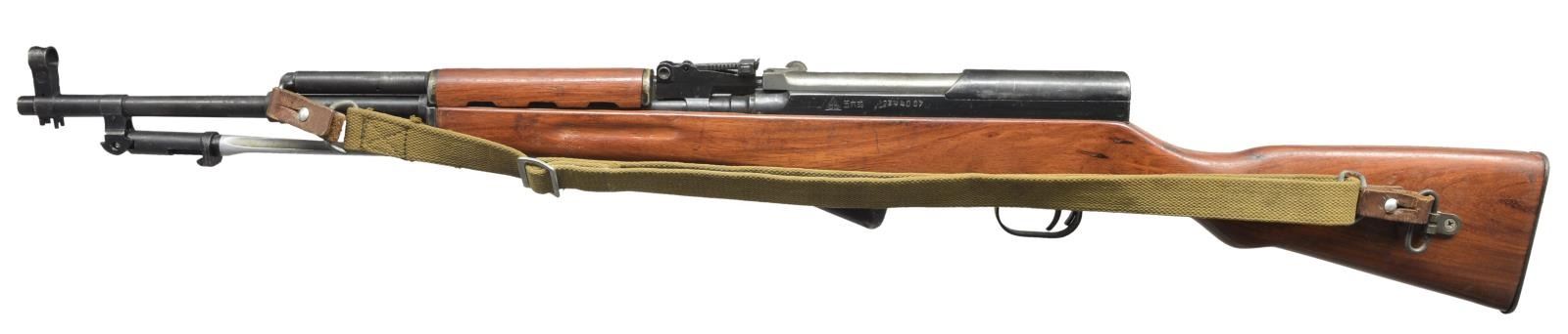 ALL: cal. 7.62x39. 1) CHINESE. S# 12344007. Bbl. 20 3/8". Receiver marked on left side w/ triangle 26, 3 Chinese characters original S# 38816 matches on bolt, trigger guard, mag. & receiver cover. Tangent rear sight graduated to 1,000m. Post front sight w/ protective hood. Cleaning rod is not present. 8 7/8" Folding spike bayonet. Bayonet screw is rnd. head replacement. Green web sling w/ leather collars. Hardwood stock & handguard. CONDITION: stock set has arsenal rework finish w/ moderate wear, staining & handling marks. Metal has 60% thinning original finish w/ wear, scratches & areas of light oxidation, notable on receiver cover & bolt. Very good shiny bore. (21-1173/RW). 2) RUSSIAN MODEL SKS-45. S# RH209250. Bbl. 20 3/8". Receiver marked on left side w/ import marking "RUSSIA SKS-45 7.62x39 KBI, INC HBG, PA" Original S# "OB1101" matches w/ all visible numbers match. Tangent rear sight graduated to 1,000 m. Post front sight w/ protective hood. Cleaning rod is present. 9 1/4" Fullered blade folding bayonet. Hardwood stock set. CONDITION: wood & metal retain high degree of arsenal rework finish w/ very light wear & scattered handling marks. Very good shiny bore. (21-1174/RW). ALL CURIO. $600-900.