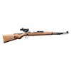 Cal. 22 LR. S# 9305151. Bbl. 20 ½". Blade front sight with German-style hood. Tangent rear sight graduated to 200m. Receiver-mounted Chinese 2.75x18 scope; the scope has a front rubber eyepiece, a duplex crosshair reticle, and very good optics. Receiver top is also grooved for additional scope mounting. Chinese-made Mauser-style training rifle that resembles the WWII German KKW. Matching number on cocking piece. Left side of the receiver has a Navy Arms import marking. Blued finish. Hardwood pistol grip stock with left side sling provisions and tan sling. MAGS: One 5-rd. CONDITION: The stock shows some scattered moderate flaking, dings, and handling marks. Metal retains 95% of its original blue, with some edge wear, handling marks, and light oxidation on the rear band. Action functions properly when hand-cycled. Bright, near-excellent bore. (24-7147/MJC). MODERN. $200-400.