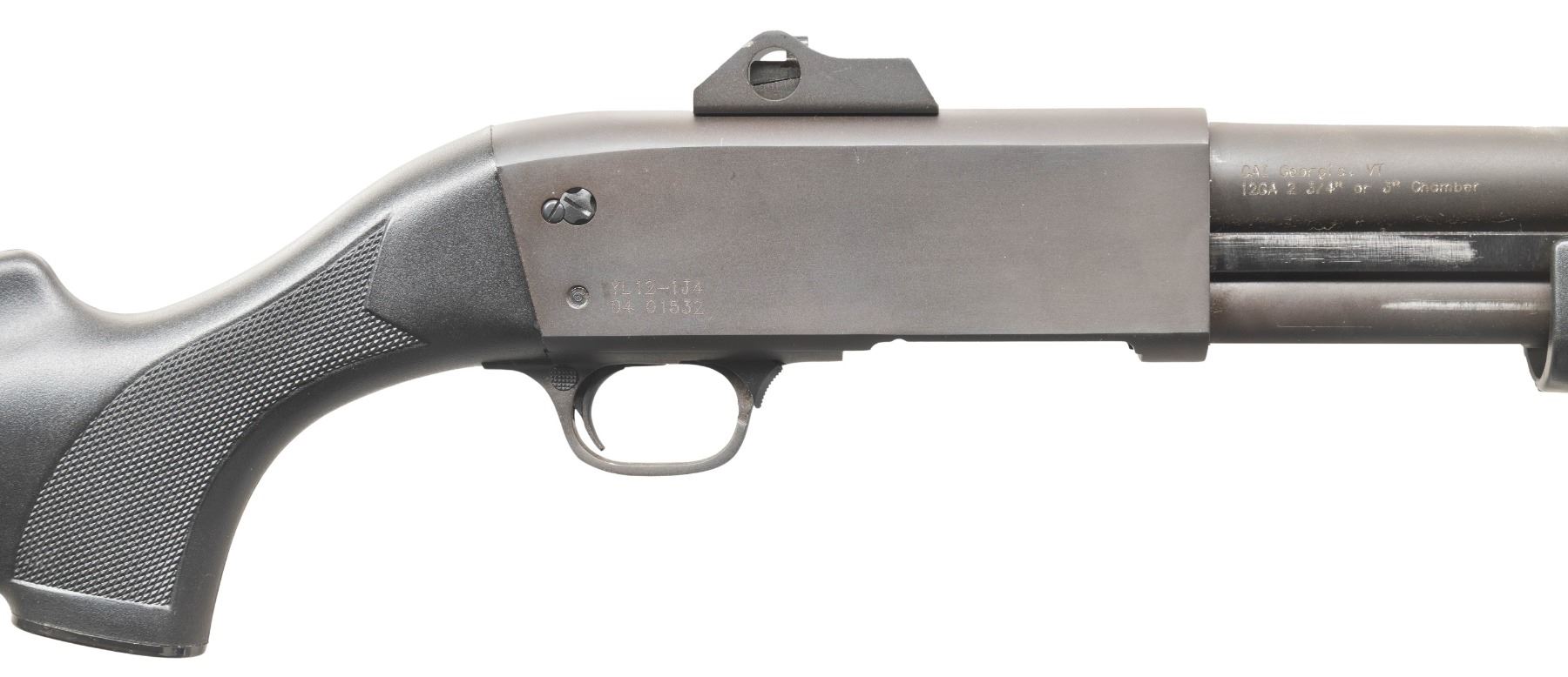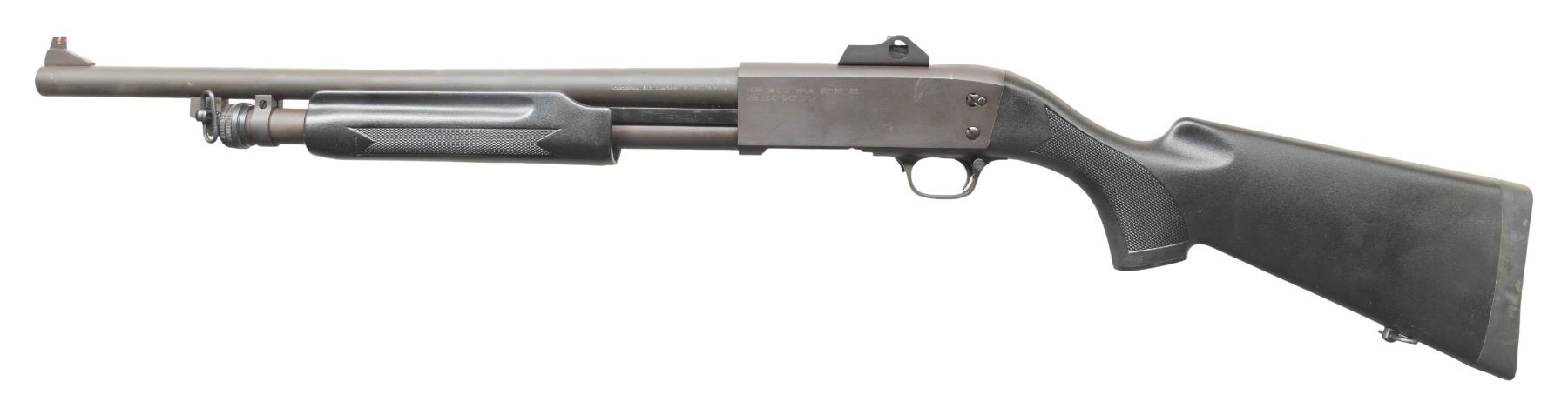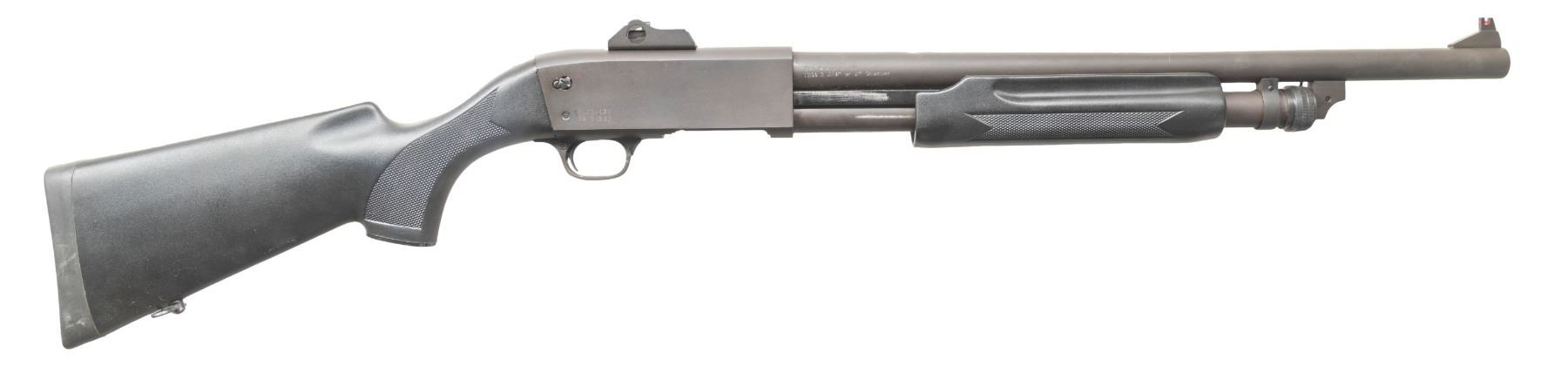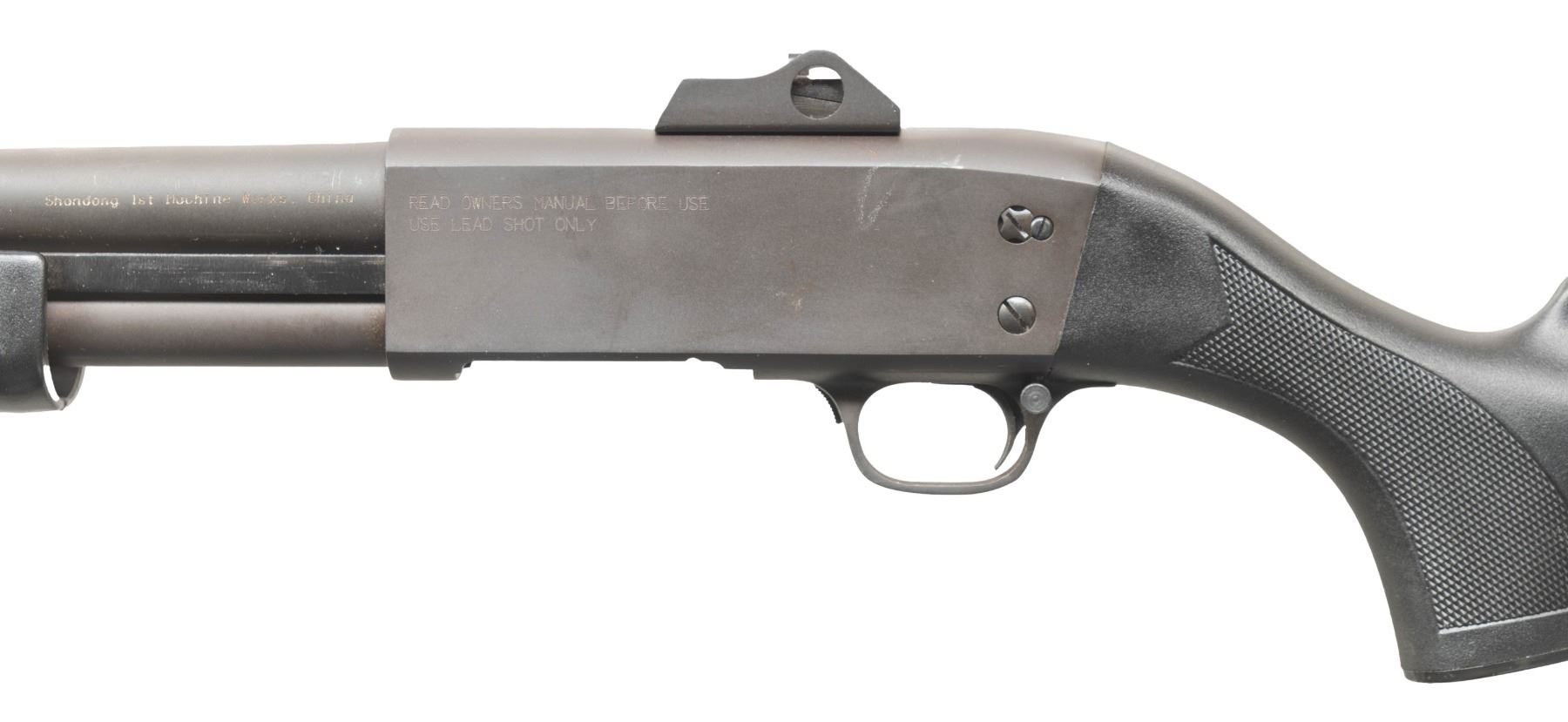 Cal. 12 Ga., 2 3/4" & 3". S# 04 01532. Mfg. 2004 in China by Shan dong 1st Machine Works as a copy of the Ithaca M37 shotgun; Imported by CAI. Bbl. 19" w/ fiber optic front & Williams style ghost ring rear sight. Matte black metal finish. Black synthetic stock set. CONDITION: near excellent showing light handling wear. Shiny bore shows fouling throughout. PROVENANCE: From the PMRB Collection. (25-5804/MD). MODERN. $300-400.