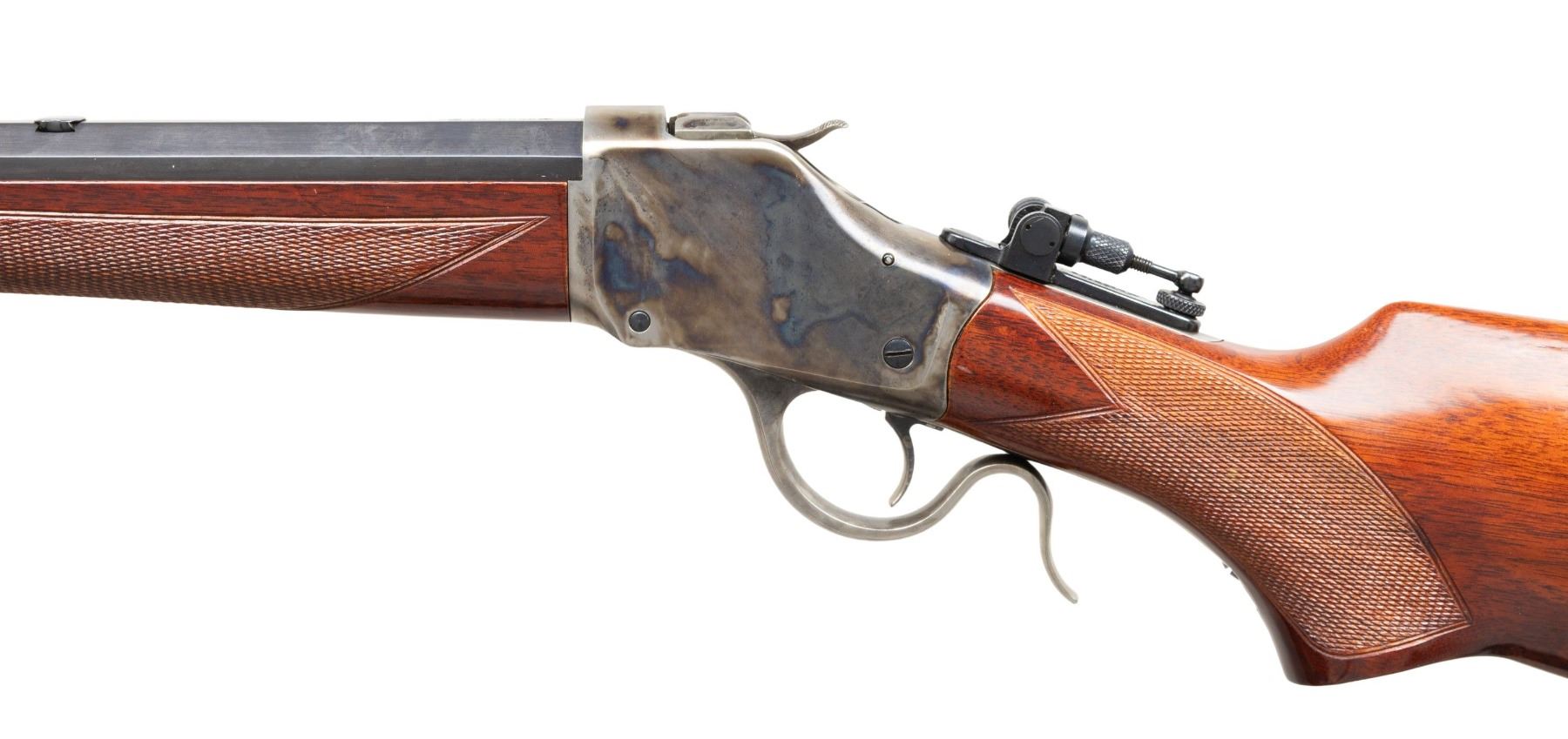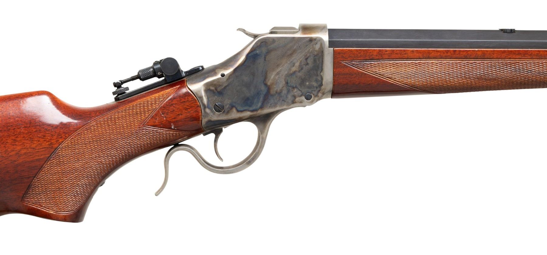 Cal. 30-40 Krag. S# S02297. Bbl. 30" oct. Hooded globe front sight. Tang mounted folding Marbles aperture rear sight. Bbl. address & cal marking both have two screw holes that appear to have been added later. Case colored action. Blued bbl. Checkered walnut pistol grip stock & forend. CONDITION: stock shows a couple dings & some handling marks. Metal retains 95-97% original finishes with some handling marks & light freckling. Action functions properly when hand cycled. Bright near excellent bore. PROVENANCE: From the Buckstix Collection. (25-6417/MJC). MODERN. $1,000-1,500.