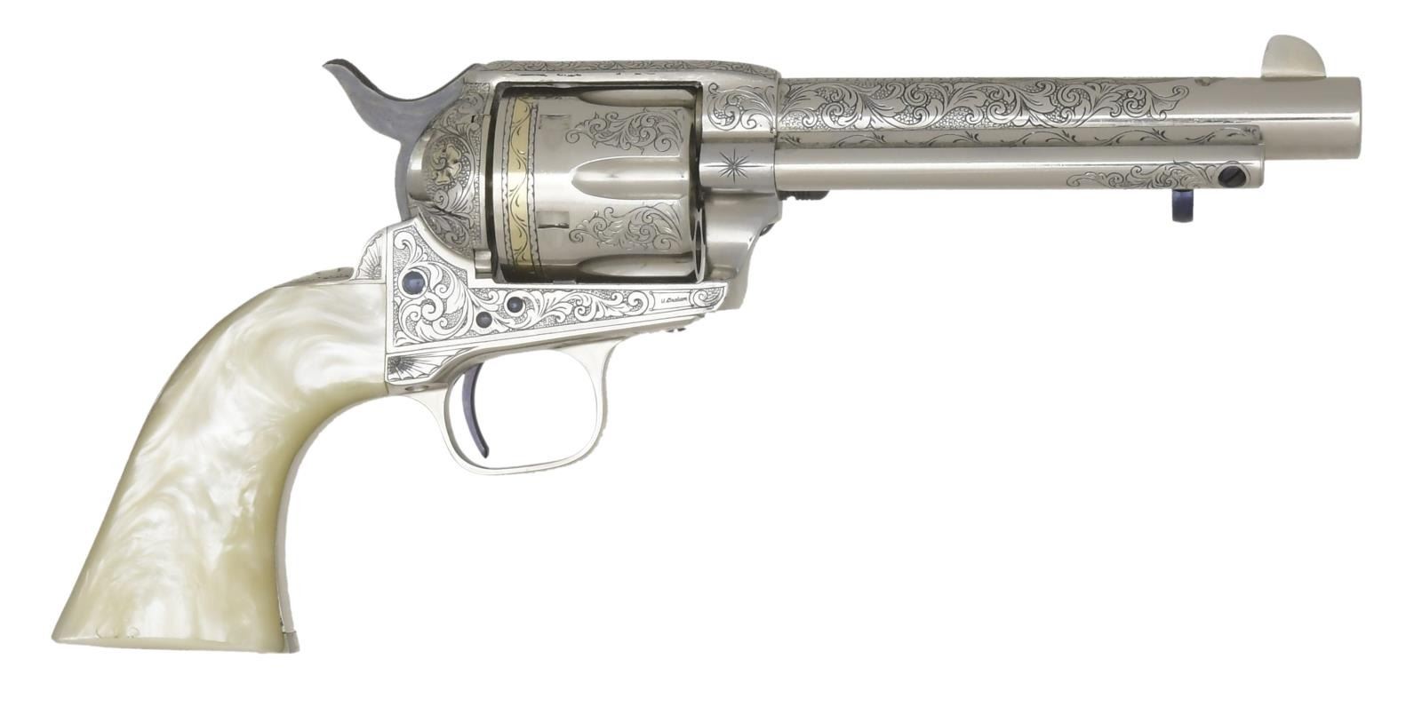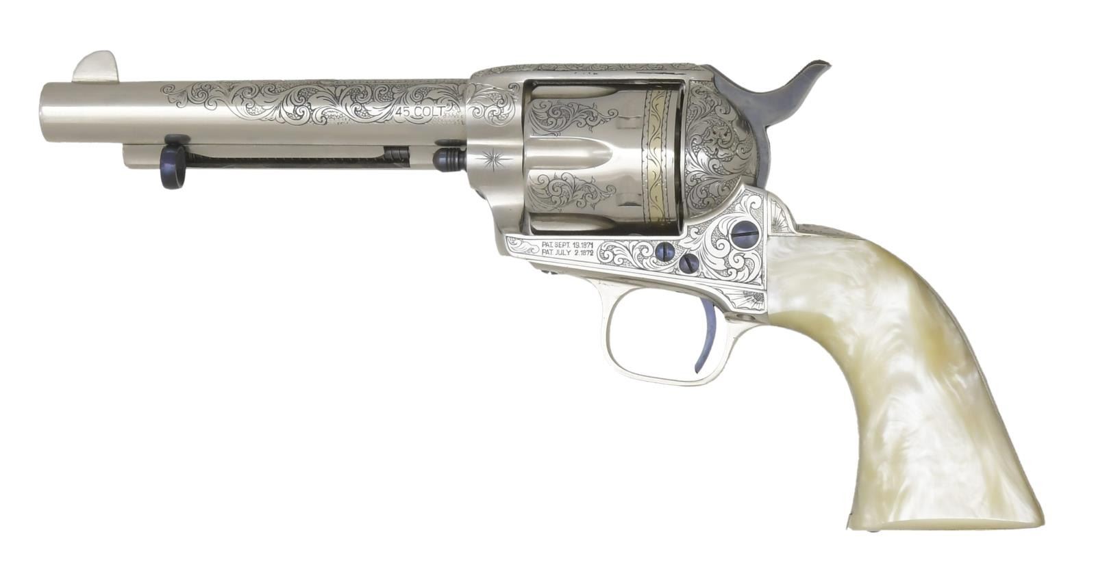 Cal. 45 LC. S# C107438. Bbl. 5 1/2" w/ blade front sight & frame notched rear. Mfg. in Italy by Uberti w/ black powder style frame. Nickel plated w/ fire blued accents to include bullseye ejector rod head. Matching numbered grip frame & cyl. "CAT 1519" by frame S#. Floral engraving w/ punch dot backgrounds. Lower right front of frame marked "V. Graham". 1 Piece simulated pearl grips. Gold colored band around rear of cyl. plus gold colored NRA eagle at top of backstrap having gold colored banner along length of backstrap having "NATIONAL RIFLE ASSOCIATION OF AMERICA". CONDITION: all aspects near excellent including grips & bore. Appears unfired. (21-3428/NW). MODERN. $400-600.