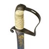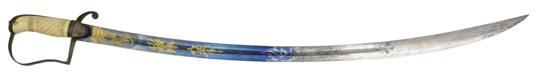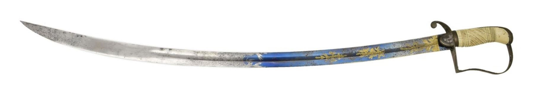 Overall length: 35 1/2". Blade length: 30 5/8”. Blade has a single wide fuller with gold highlighted etching on a blued field over the first 15”. Etching includes various foliate motifs and 2 large sprays of arms. Silvered brass hilt having a turned down quillon and spade languets. Plain chamfered knuckle bow with a knot slot near the pommel. Bird’s head pommel with plain backstrap. Carved bone grip. No scabbard. CONDITION: blade has a light gray finish with some wire brush marks in the area of the tip. Blue & gilt decoration is 90%+. Silver plating on the hilt is about 30% with the balance being brass showing a mustard patina. Grip has a few tight age cracks and one notable chip near the pommel. (02-20056/BF). $400-600.