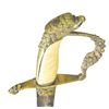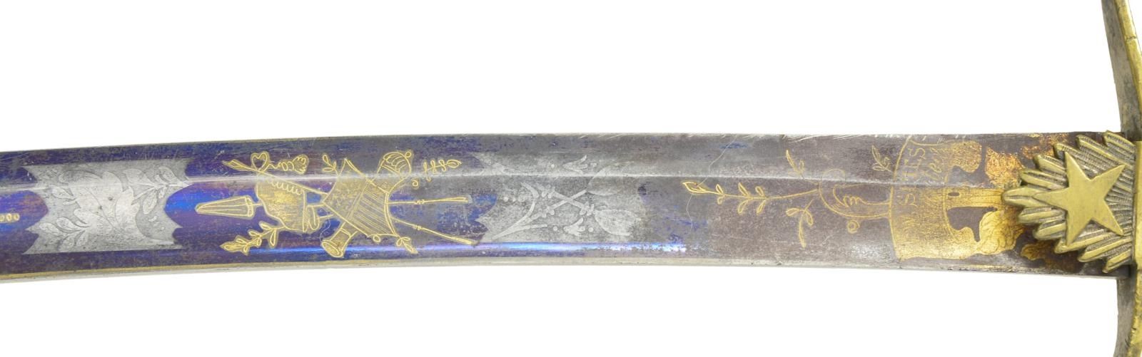 Overall length: 38 3/8”. Blade length: 30 1/4". Tri-color blade has a single wide fuller with gold highlighted etching on a blued field over half the length of the blade. Etching includes a spray of arms with federal shield along with foliate & patriotic motifs. A ribbon near the hilt reads “A.W. SPIES WARRANTED”. There are 2 small etched white panels on each side of the blade. Silvered brass hilt with a large star on each languet. Plain guard with star & leaf decorated drop quillon. The knuckle bow is highly embellished with floral & foliate motifs. Eagle head pommel with plain backstrap. Carved certifiably antique ivory grip. Silver plated brass scabbard with engraved foliate motifs & American eagle. CONDITION: blade shows a light gray patina with expected overall wear. Hilt is a bit loose & slightly misshaped. The rear languet is missing the bottom 1/3. Silver plating is about 20% intact. Grip is undamaged. Scabbard shows a deep mustard patina with scattered areas of sliver plate remaining. There is a significant crack at the mid-point of the scabbard. (02-19185/BF). $1,200-1,700.