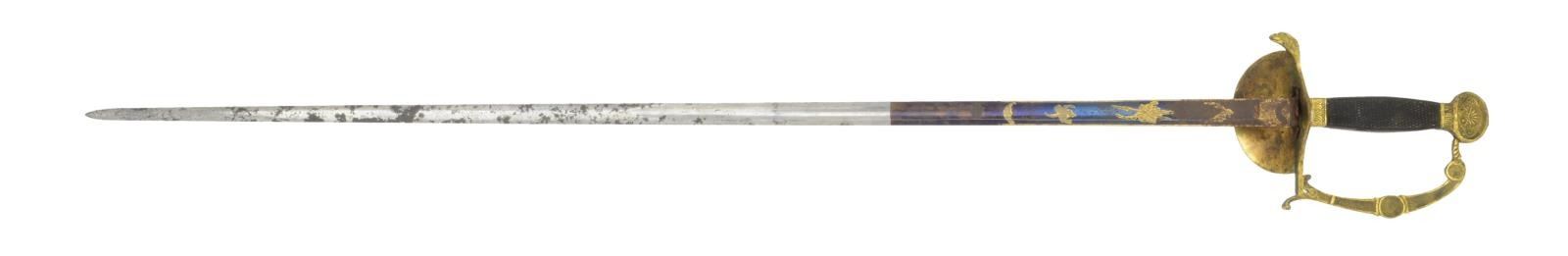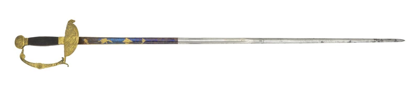 Overall length: 37 3/8". Blade length: 32 3/8". The overall form of this sword is seldom seen but is exceptionally rare utilizing a Naval motif. The blade has a single wide fuller and is decorated with gold highlighted etching on a blued field over the first 10 1/2" of the blade. Etching includes military & foliate motifs featuring a classical stand of arms. This sword features an exceptional gilded brass hilt with a large downturned guard displaying a spread-wing American eagle on anchor. There is an eagle head quillon & a heavily embellished knuckle bow of classical form & motif. The ovoid lozenge pommel features an American eagle on one side with 17 stars above and a shell & flourish motif on the other. 1 Piece wood grip with fine crosshatching on each side. No scabbard. CONDITION: blade has a light gray finish with some spotty oxidation. Etching & blued field are vibrant, though there is some oxidation near the hilt. The hilt retains nearly all of its original gilded finish and details have remained exceptionally sharp. Grip shows light expected wear. (02-19586/BF). $800-1,200.