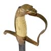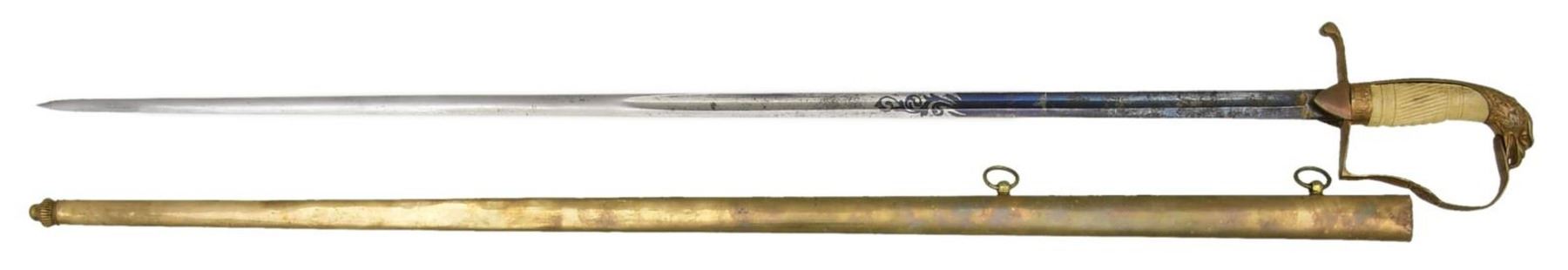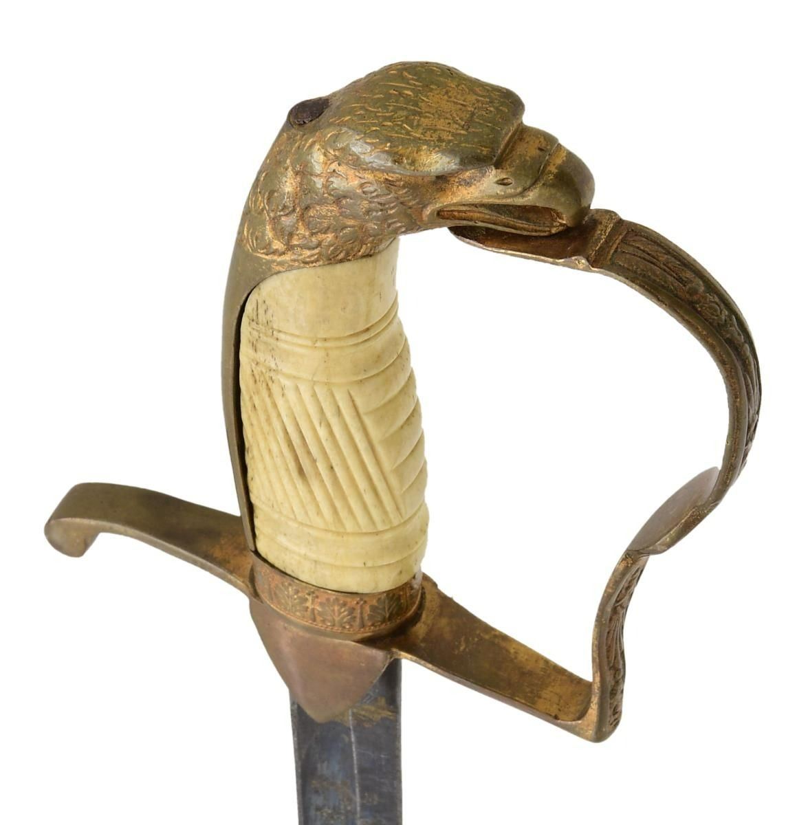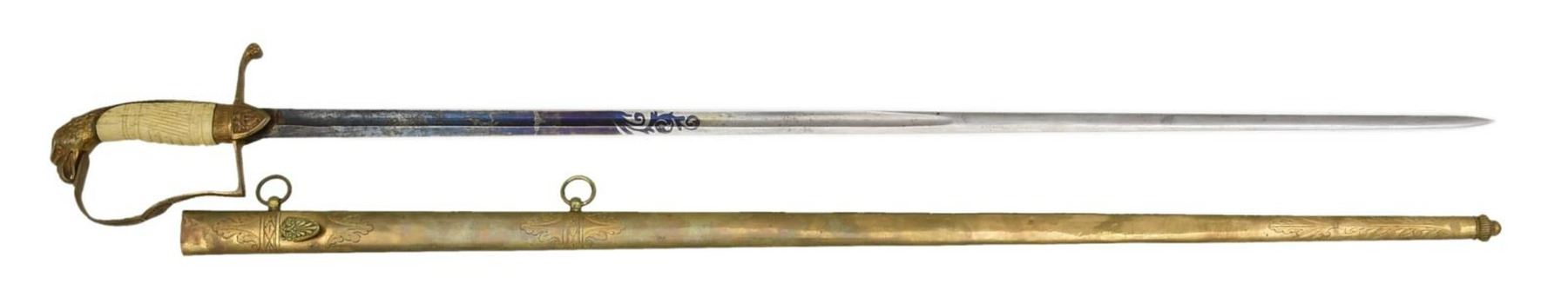 This foot officer’s sword measures 37 1/2" overall with a blade length of 31 1/2”. The blade has a single medium fuller and has gold highlighted etching on a blued field over 11 1/2" of the blade. Etching includes foliate motifs & sprays of arms. Gilded brass hilt with a Medusa head languet on the front. Plain guard with downturned, lightly embellished, cylindrical fuller. Highly embellished reverse P knuckle bow leads to a well-articulated eagle head pommel atop a plain backstrap. Grip is intricately carved bone. Gilded brass scabbard with foliate embellishments. CONDITION: blade has a light gray patina with 80% of the blued field remaining, and 20% of the gold highlights. Hilt retains approx. 35% of its original gilded finish. Grips have a few tight age cracks. Scabbard retains traces of its original gilded finish and has a few minor shallow dents. (02-20052/BF). $600-900.