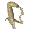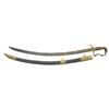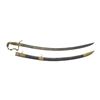 SABER. Overall length: 36 1/4". Blade length: 30 1/8”. This saber is likely of Widmann design and has a blade with a single wide fuller with gold highlighted etching on a blued field extending over half its length. Etching includes patriotic & foliate motifs featuring a spray of arms with federal shield. Silvered brass hilt with eagle embellished spade languets. Plain guard with scallop shell quillon. Embellished knuckle bow with an interesting wreath at the top being held in the eagle’s mouth. Grapevine decorated ferrule with wire-wrapped grip. Silvered brass mounted leather scabbard. CONDITION: blade has a dark patina. The majority of the blued field is barely visible. Gilded etching remains reasonably strong. Quillon is bent down & hilt is slightly misshaped. Only traces of silver finish remain on the hilt. The wire wrap has a period repair in the center. Scabbard mounts show only traces of original silver. Leather remains strong. (02-19189/BF). $1,200-1,600.