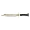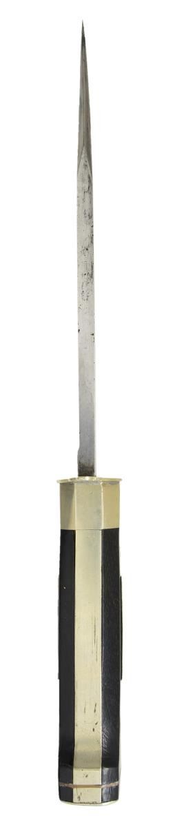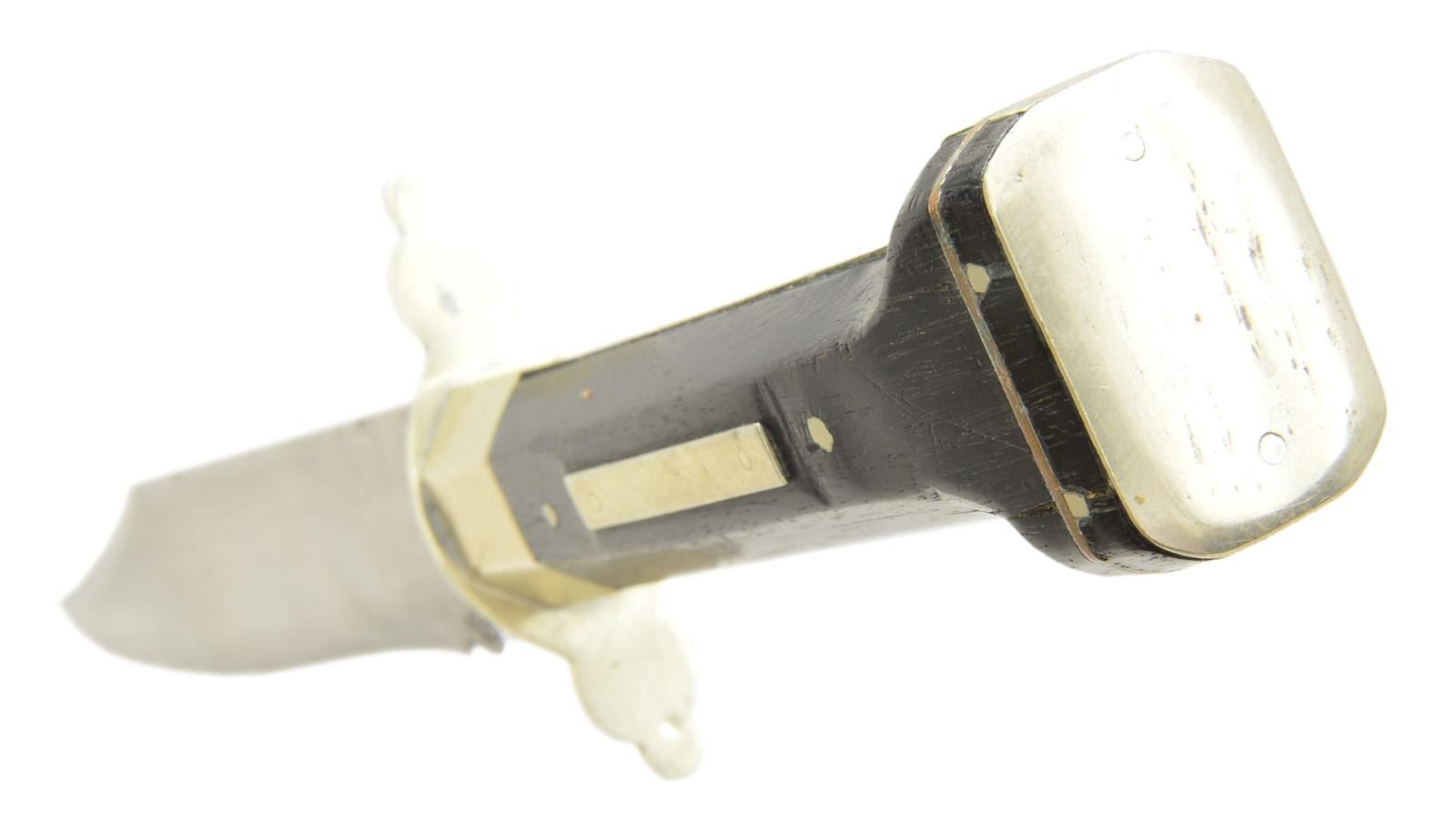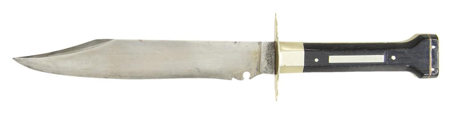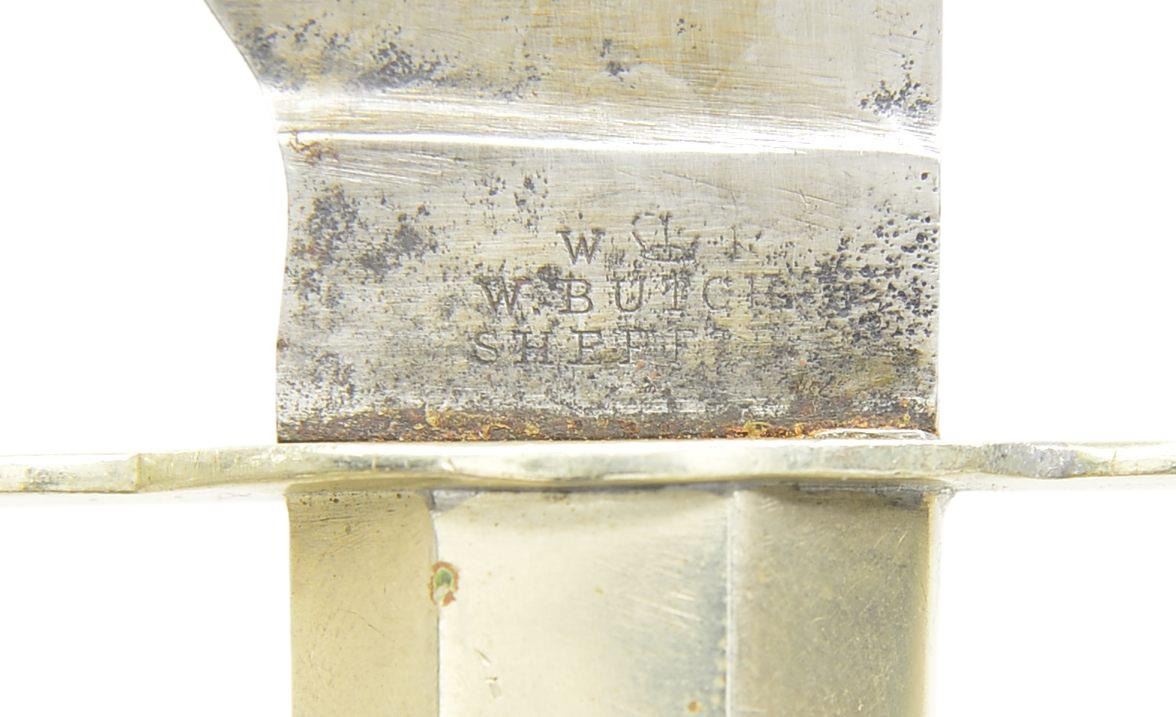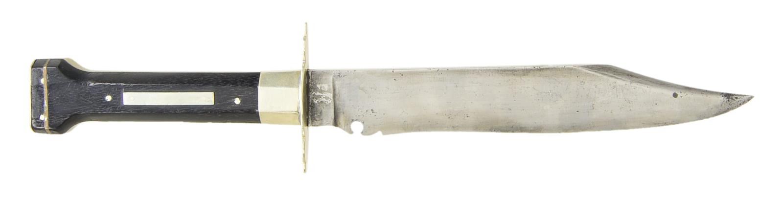 13" Overall, 8" clip point blade w/ Spanish notch marked “W. BUTCHER / SHEFFIELD” under cipher for King William IV (1832-1836). This is an attractive example of among the earliest bowie knives. CONDITION: very good to fine overall. Cleaned blade is gray w/ sharpening, there is staining & light pitting. German silver mounts are clean w/ silver patina. There is a professionally restored chip repair & a few sm. cracks in ebony slab grips. (02-15553/JS). $3,000-5,000.