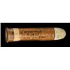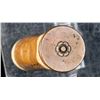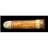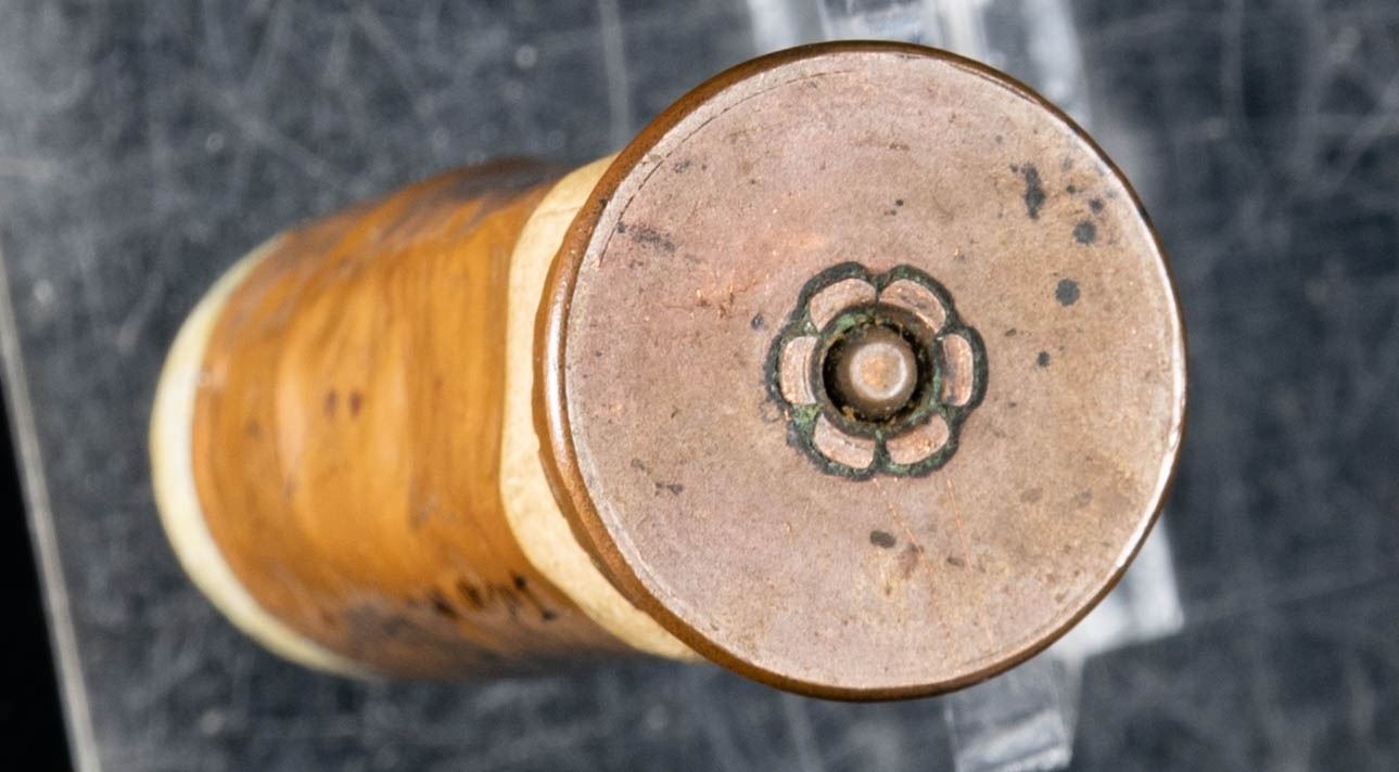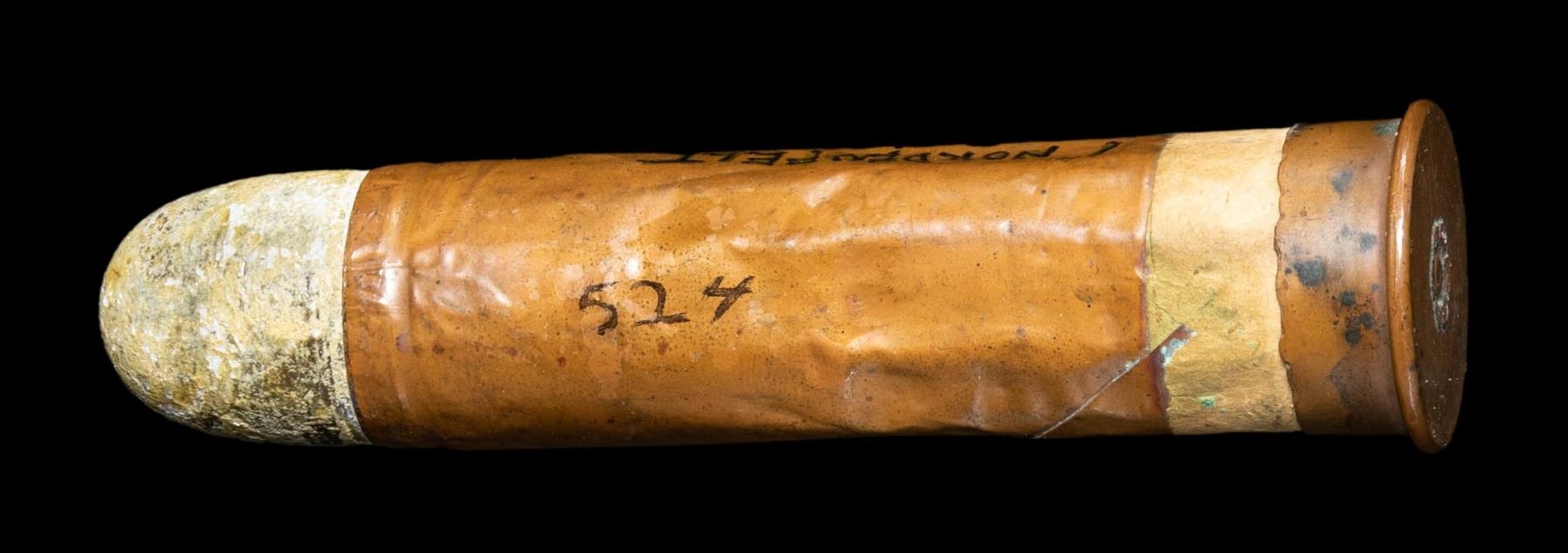 ROUND. A single cartridge produced circa. the 1870s-1880s for a gatling or Nordenfelt gun. "Coiled" brass cartridge casing with lead projectile. Base of cartridge is unmarked, save for a floral motif which encompasses the primer. Cartridge body features a strip of apparent tape around the circumference at and around the base area. Cartridge is complete with a large rnd. lead projectile. Side of cartridge is marked "524" below a layer of lacquer in black ink, followed by a later added "1" NORDENFELT/ C. : 1875/ Indian Wars $300..". Round is housed within a contemporary black cardboard box with cardboard and glass panel lid. CONDITION: brass cartridge has acquiring a pleasing mellow patina, with scattered spots of darker patina overall. Base shows scattered spots of chipping along the edges at the cartridge body. Lead projectile has acquired a white oxidized appearance. PROVENANCE: Norman Olliff Estate. (02-25680/MLW). AMMUNITION. $100-200.