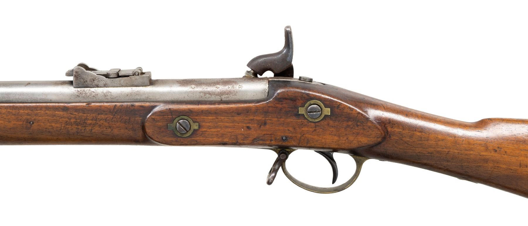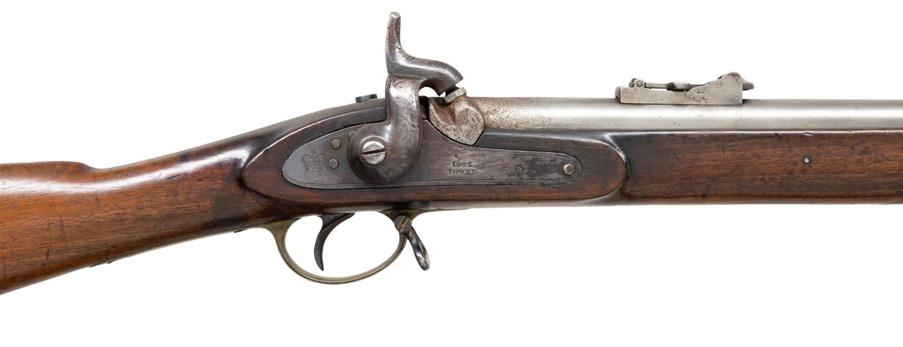 Cal. 61. NSN. Standard pattern 1853 Tower musket, cut-down to 37.5", 24 gauge Birmingham proofed barrel reamed out to 61 caliber smoothbore. 1862 dated Tower lock with crown. CONDITION: good overall. Replaced nipple & band screws. Mechanics fine, good smooth bore. PROVENANCE: Estate Collection of John "Jack" Dhooghe. (01-28232/JS). ANTIQUE. $500-700.