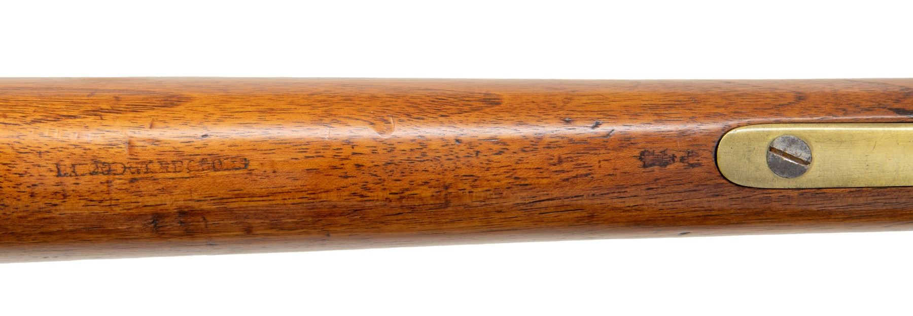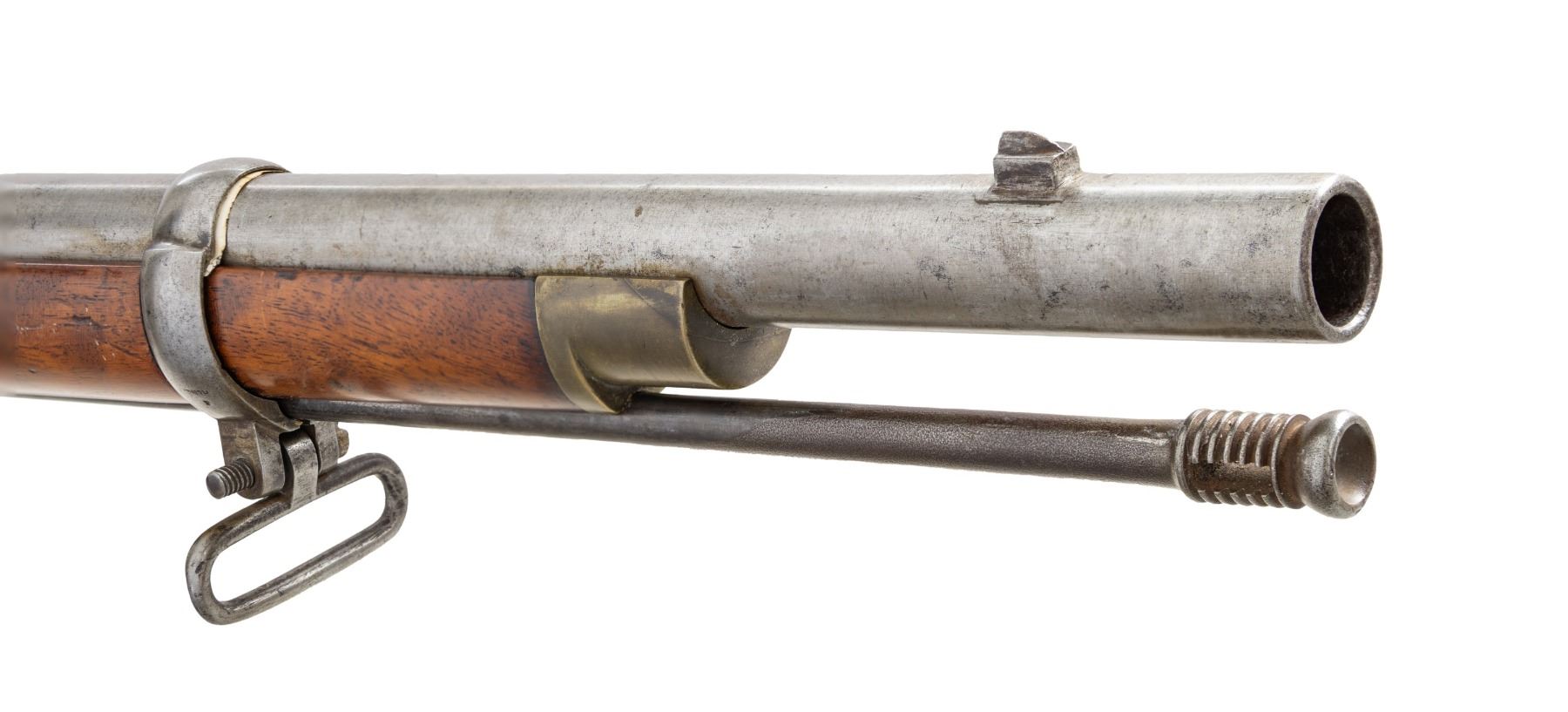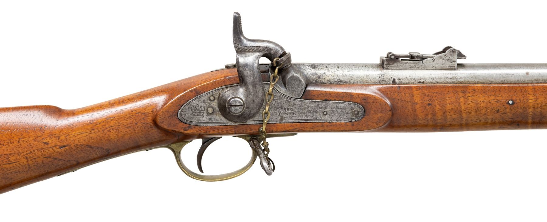 Cal. 577. NSN. This is an honest example of the most popular imported longarm, both North & South. Standard configuration, brass furniture, 3 clamping iron barrel bands, 39" Birmingham proofed barrel, 1862 dated "TOWER" lock and crown at tail. Original chained nipple protector attached to rear sling swivel. CONDITION: complete & original, metal cleaned, iron has gray patina, brass has toned patina, good markings in metal. Stock sanded and re-finished, mechanically fine, good rifled bore. PROVENANCE: Estate Collection of John "Jack" Dhooghe. (01-28237/JS). ANTIQUE. $800-1,200.