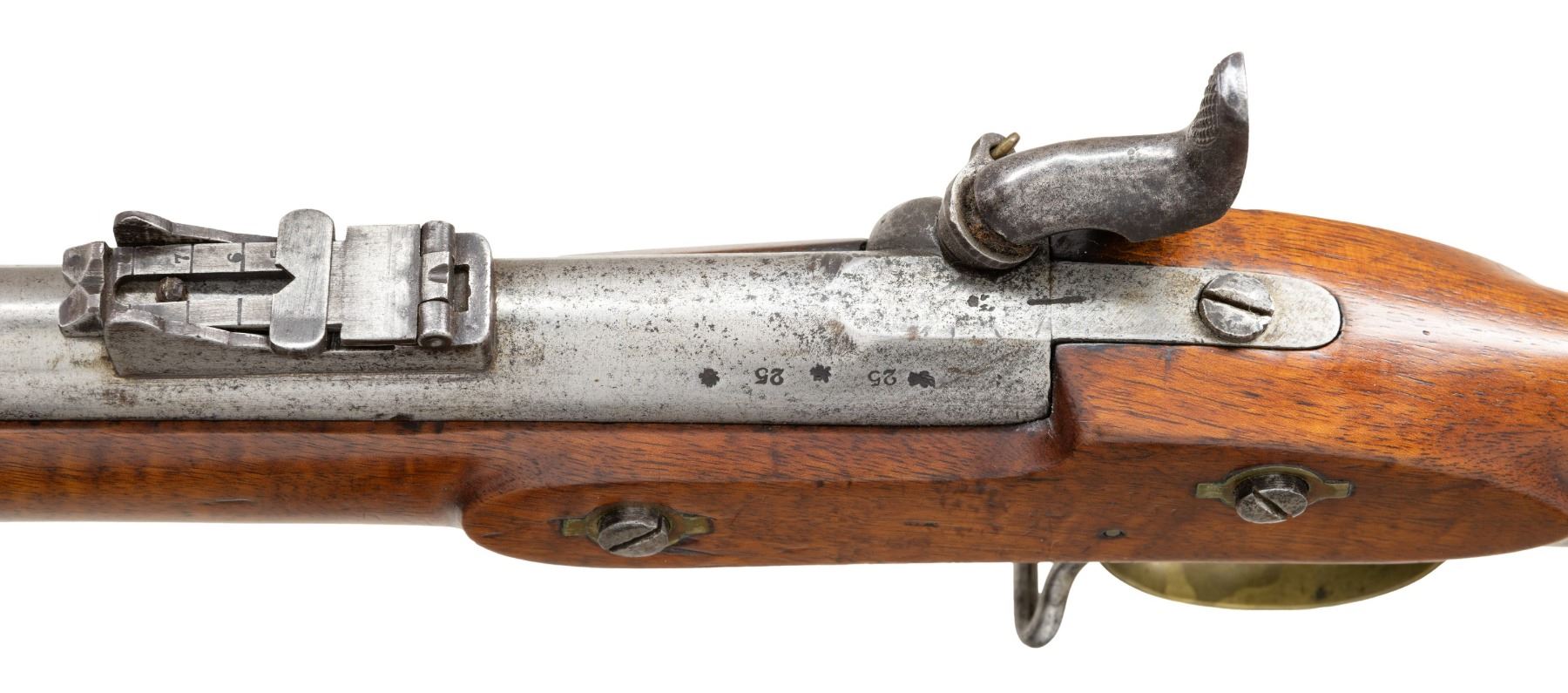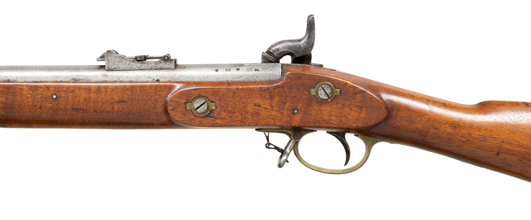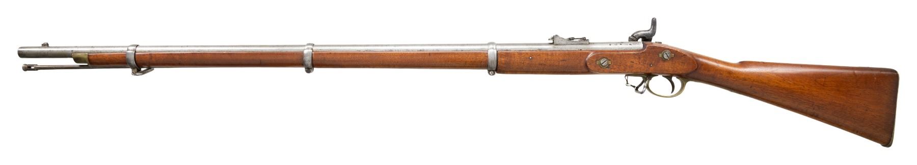 Cal. 577. NSN. This is an honest example of the most popular imported longarm, both North & South. Standard configuration, brass furniture, 3 clamping iron barrel bands, 39" Birmingham proofed barrel, 1862 dated "TOWER" lock and crown at tail. Original chained nipple protector attached to rear sling swivel. CONDITION: complete & original, metal cleaned, iron has gray patina, brass has toned patina, good markings in metal. Stock sanded and re-finished, mechanically fine, good rifled bore. PROVENANCE: Estate Collection of John "Jack" Dhooghe. (01-28237/JS). ANTIQUE. $800-1,200.