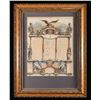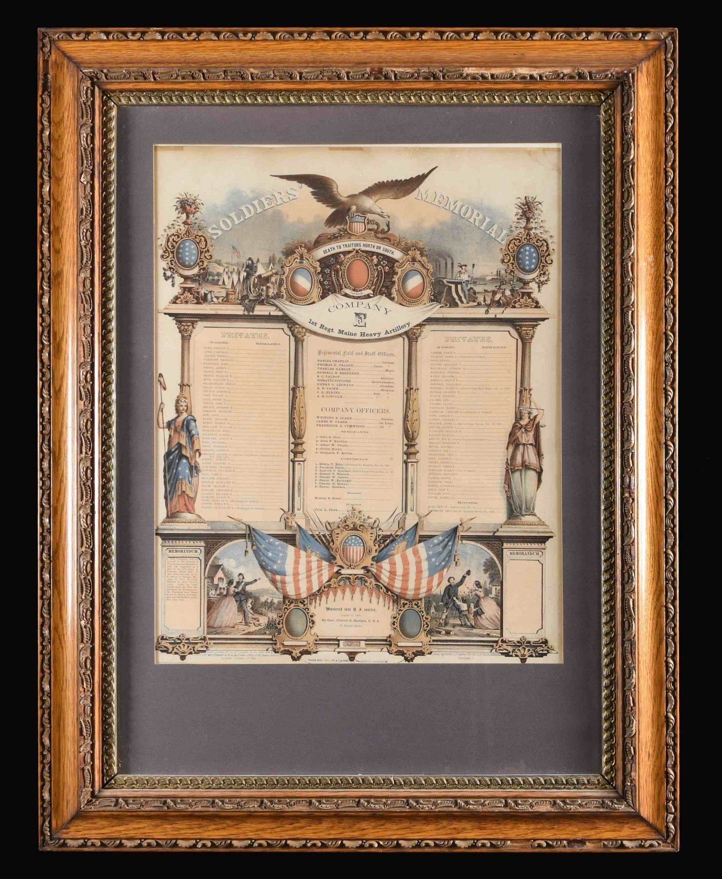 MEMORIAL. This beautifully framed polychromatic soldier's memorial measures 33 1/2' x 25 1/2'. It memorializes the members of Company E of the 1st Regiment Maine Heavy Artillery. This was a very famous and lauded regiment from the great State of Maine that entered service in August of 1862 and served until September of 1865. At the Battle of Spotsylvania Courthouse the Regiment lost 6 officers and 76 men killed with a whopping 6 officers and 388 men wounded. Later, the Regiment suffered the single greatest loss of life of any Union Regiment during the entire war. The 1st Maine had 7 officers and 108 men killed with 25 officers and 464 men wounded out of a 900 man force. CONDITION: The memorial has vivid colors and displays superbly. Flame shows light wear. (02-24523/BF). $250-500.