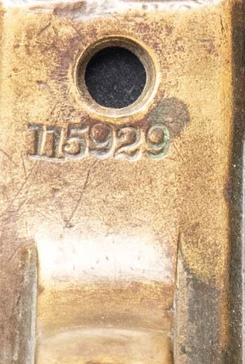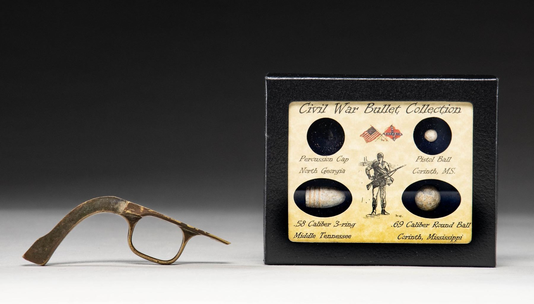 TRIGGERGUARD. Small Civil War display with 3 bullets and percussion cap. Brass Colt 1851 navy revolver loose triggerguard S# 115929, made in 1st year of war, 1861. CONDITION: good overall. PROVENANCE: Norman Olliff Estate. (02-25656/JS). NON-GUN. $50-100.