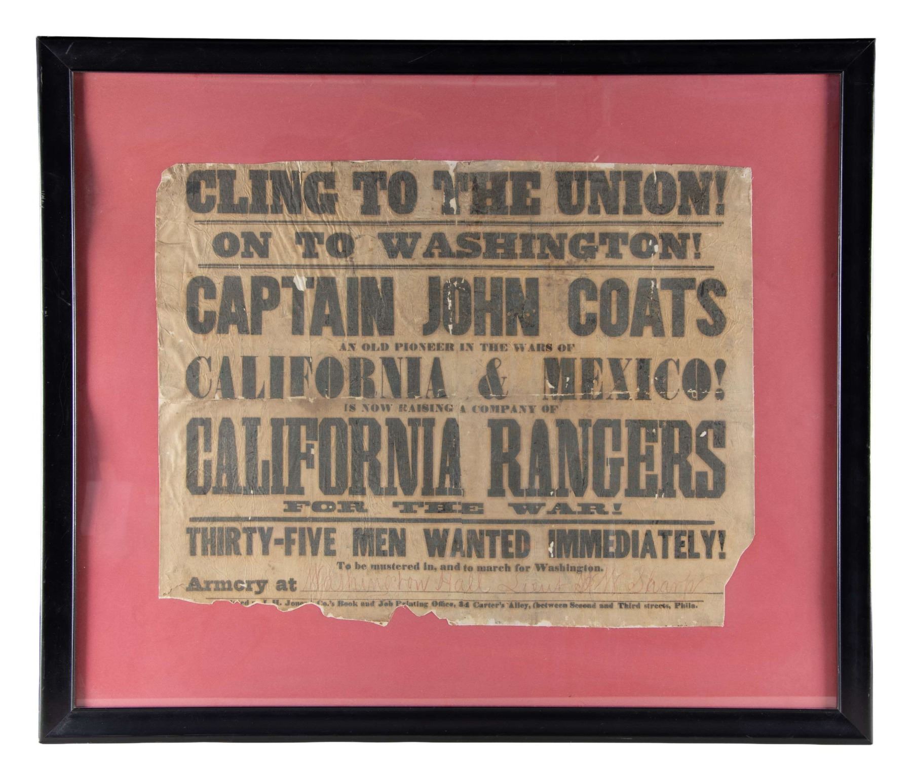 A very rare and historic 26" x 20 1/2" Civil War recruiting poster in a black 36 1/2" x 31 1/2" frame. The poster reads "CLING TO THE UNION! ON TO WASHINGTON! CAPTAIN JOHN COATS AN OLD PIONEER IN THE WARS OF CALIFORNIA & MEXICO IS NOW RAISING A COMPANY OF CALIFORNIA RANGERS FOR THE WAR! THIRTY-FIVE MEN WANTED IMMEDIATELY! To be mustered in, and to march for Washington! Armory at". On a line, following "Armory at", are the hand written words, "Washington Hall Lieut S M Sharp". Finally, at the extreme bottom is the printers information and address in Philadelphia. CONDITION: the fragile paper broadside was conserved by archivally mounting it on a cloth backing. The paper has darkened with age but is still quit legible and impressive. There are losses to most edges, however these losses do not affect the overall impression of the broadside. (02-24546/BF). $1000-2000.
