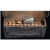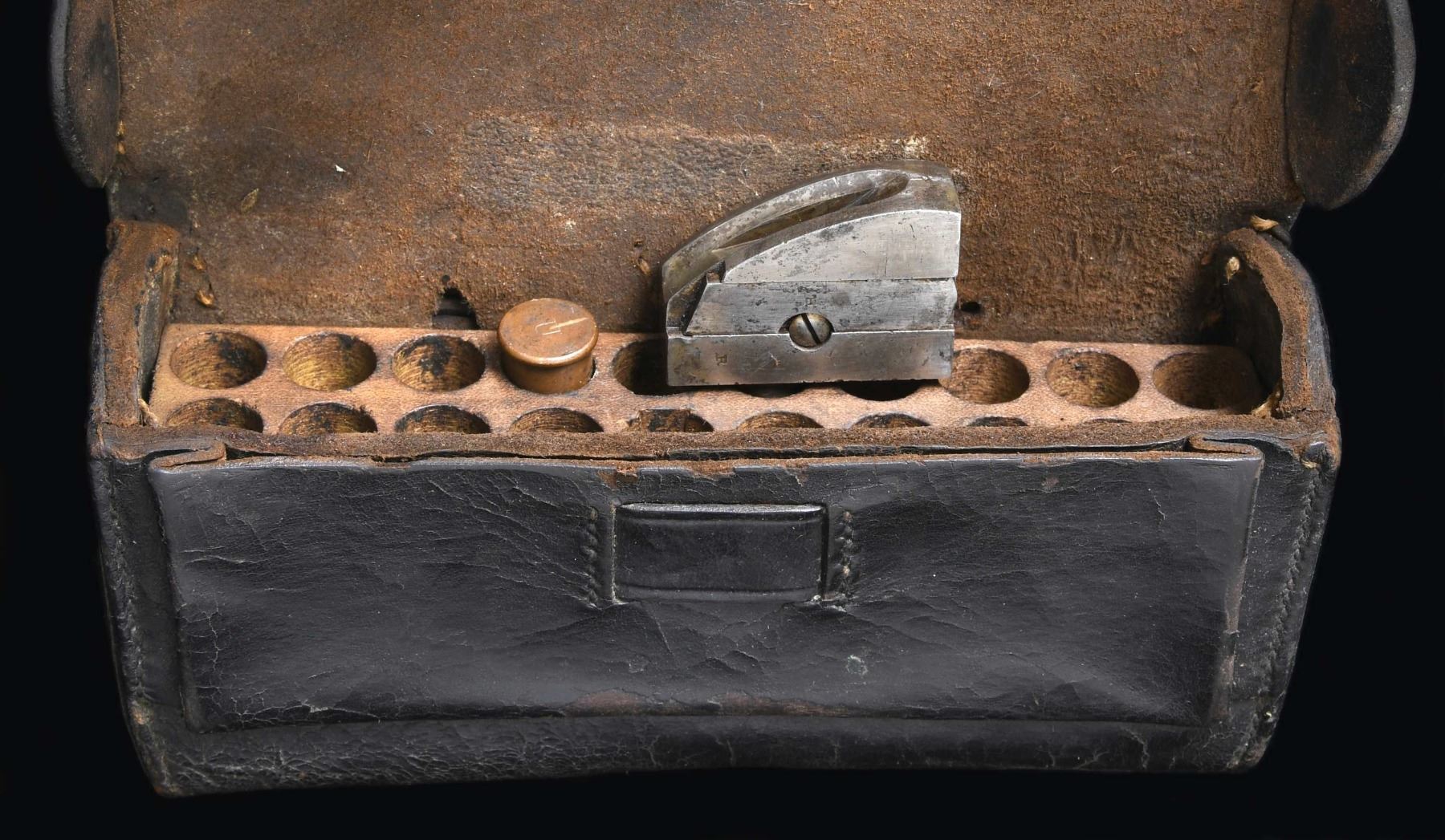 8" x 4" x 2" leather carbine box, wood block for 20 cartridges. This box saw use with initial carved on outside flap, contract name stamped on inner flap. The box has inside it a single Spencer cartridge and the top portion from a Spencer breech block. CONDITION: very good overall, complete and original other than resound replaced closure tab. (02-24276/JS). NON-GUN. $200-400.