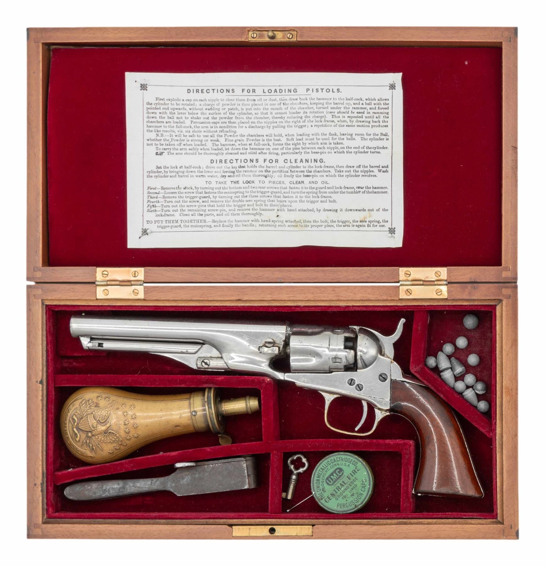 Cal. 36. S# 21600. Standard configuration made during Civil War in 1863, nickel. 5.5" round barrel with 1-line NEW YORK US AMERICA address, small "COLT'S / PATENT" right side of frame, fluted 5-shot cylinder with patent stamp in one flute. Brass trigger guard and backstrap hold varnished walnut grips. Revolver is housed in reproduction Colt-style casing compartmented for eagle powder flask, 2-cavity "COLTS PATENT" marked mold, UMC cap tin, and loose balls. CONDITION: very good overall, all matching and complete, retains over most of an old nickel finish. Grips retained 90% of their bright original factory varnish. Mechanics need attention, hammer cocks, but cylinder does not rotate, good rifled bore. Reproduction casing is fine, original eagle flask is very good and scarce maker marked "Frary, Benhan & Co", mold is good. PROVENANCE: The Esteemed Norm Greenberg Collection. (01-27662/JS). ANTIQUE. $800-1,200.