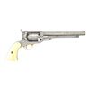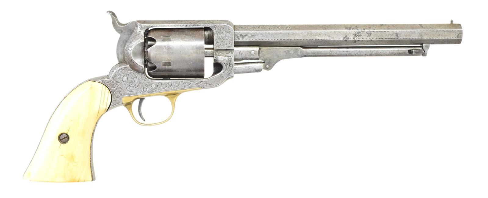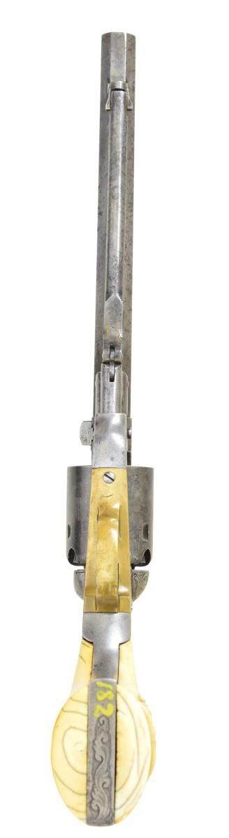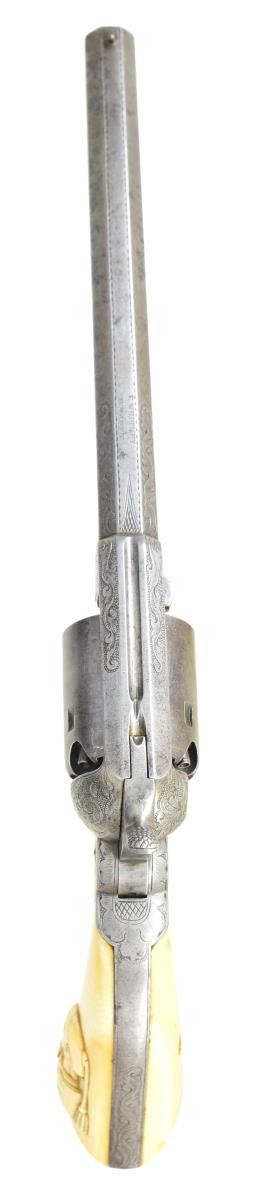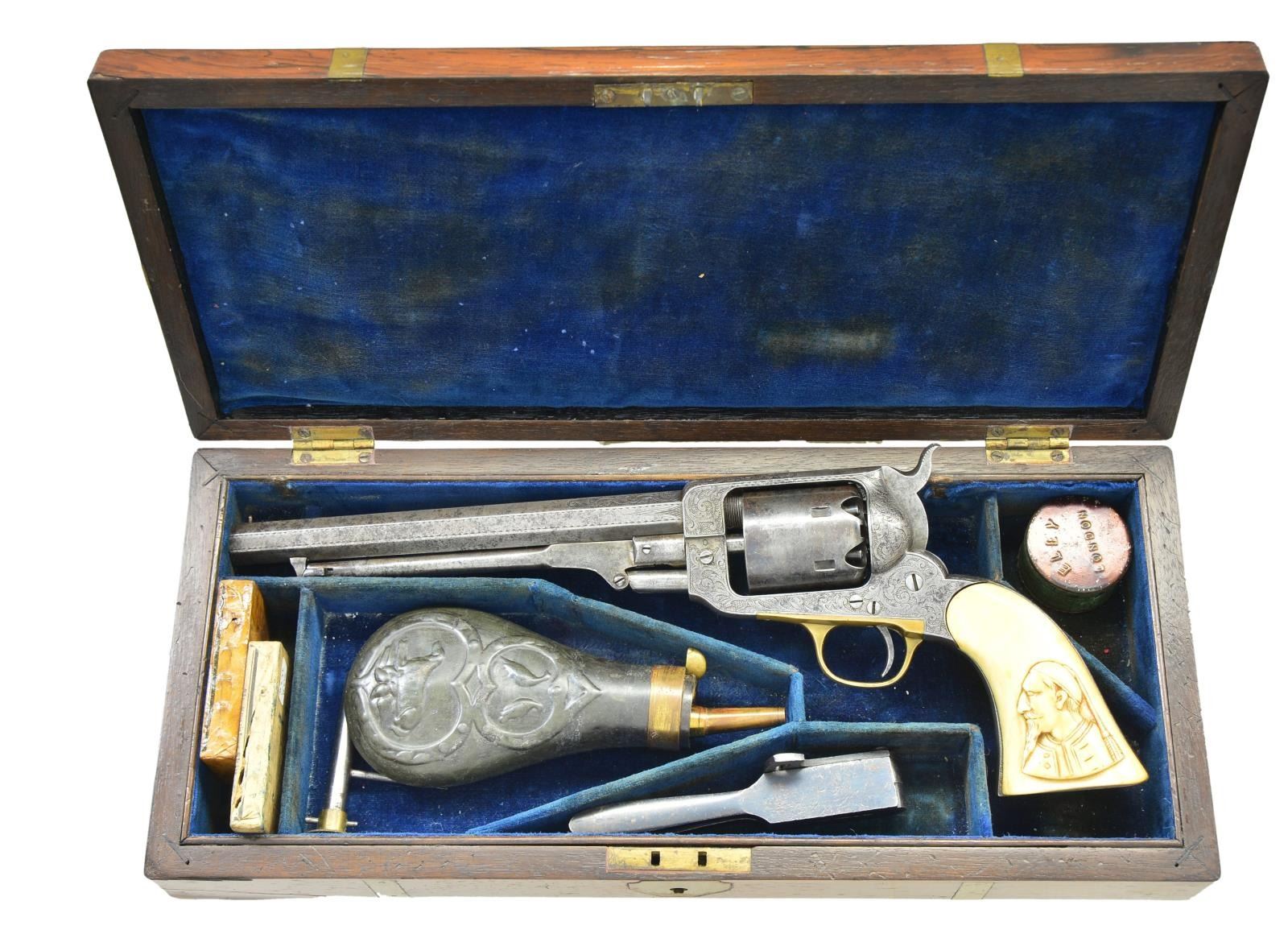 REVOLVER WITH CARVED IVORY GRIPS. Cal. 36. S#24385. Standard configuration, slightly longer 7.75” octagonal barrel with “E. WHITNEY / N HAVEN”, Brass pin front sight, rolled cylinder scene of Whitneyville shield, lion, eagle, and monitor in naval battle. Scoll & punch dot engraved solid frame & barrel. The original carved ivory grips of zouave bust on left side have matching last 2 digits on SN inked inside each half. Brass banded mahogany casing has two original wrapped woodblock packs of Sage navy cartridges for Whitney navy pistol, tin of caps, 2-cavity blued mold marked “S.T.B.”, combination tool, and decorated powder flask. CONDITION: revolver is very good overall, gray patina, hints of finish on unserialized cylinder, all matching serial numbers, grips have toned patina, mechanically fine, good rifled bore, blue baize lining worn & soiled, mold retains thinning blue, cartridge packs fair but sealed and complete. (01-22883/JS). $6,000-8,000.