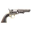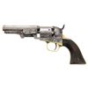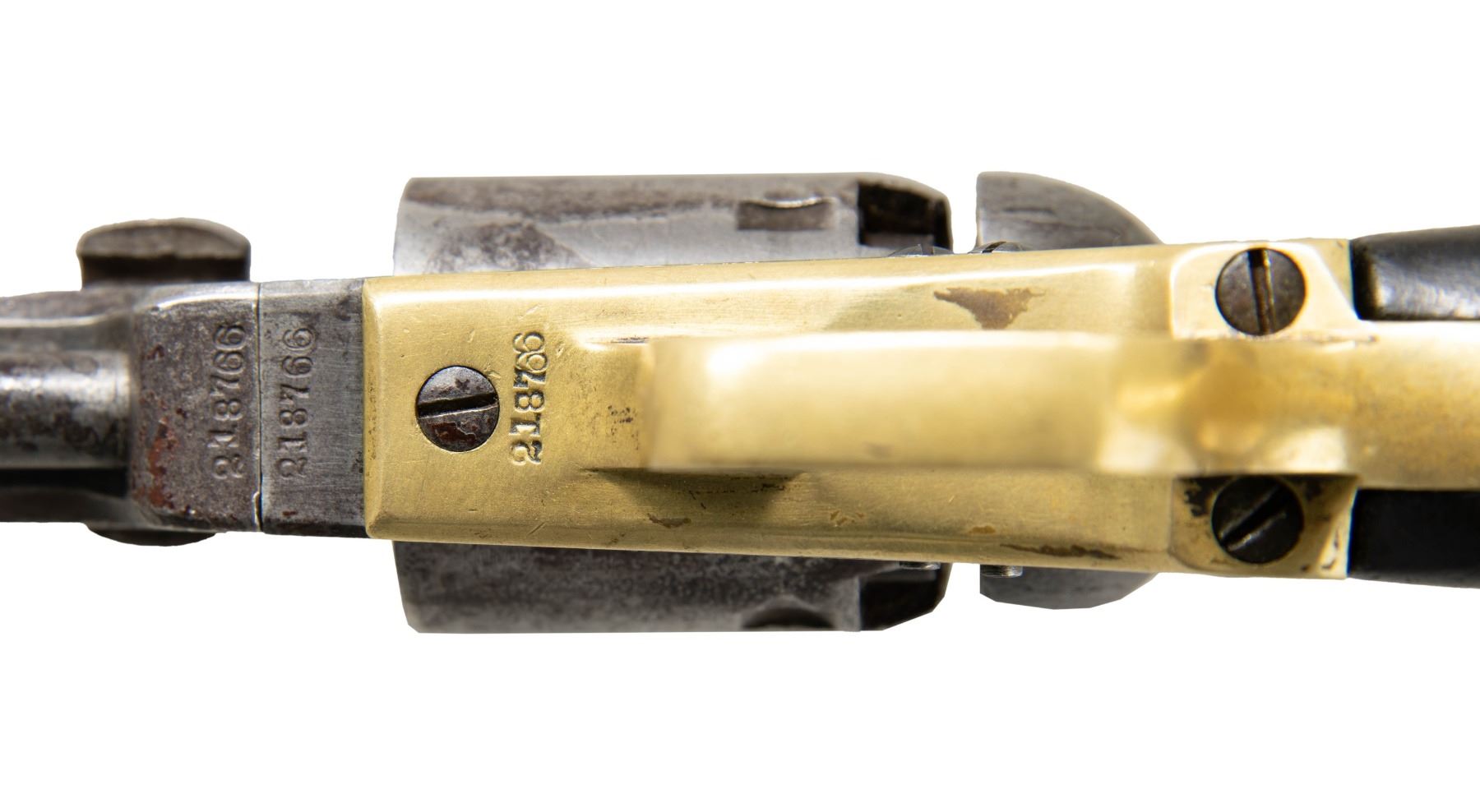 Cal. 31. S# 218766. Standard configuration made during Civil War in 1862, 4" octagonal barrel with 1-line NEW YORK US AMERICA address, small "COLT'S / PATENT" right side of frame, stagecoach holdup scene rolled 6-shot cylinder. Brass trigger guard and backstrap hold varnished walnut grips. CONDITION: good overall, all matching and complete, partial cylinder scene, mottled gray pitted metal, Mechanically functional, good pitted rifled bore, grips worn & well fit. PROVENANCE: Estate Collection of John "Jack" Dhooghe. (01-28254/JS). ANTIQUE. $600-800.