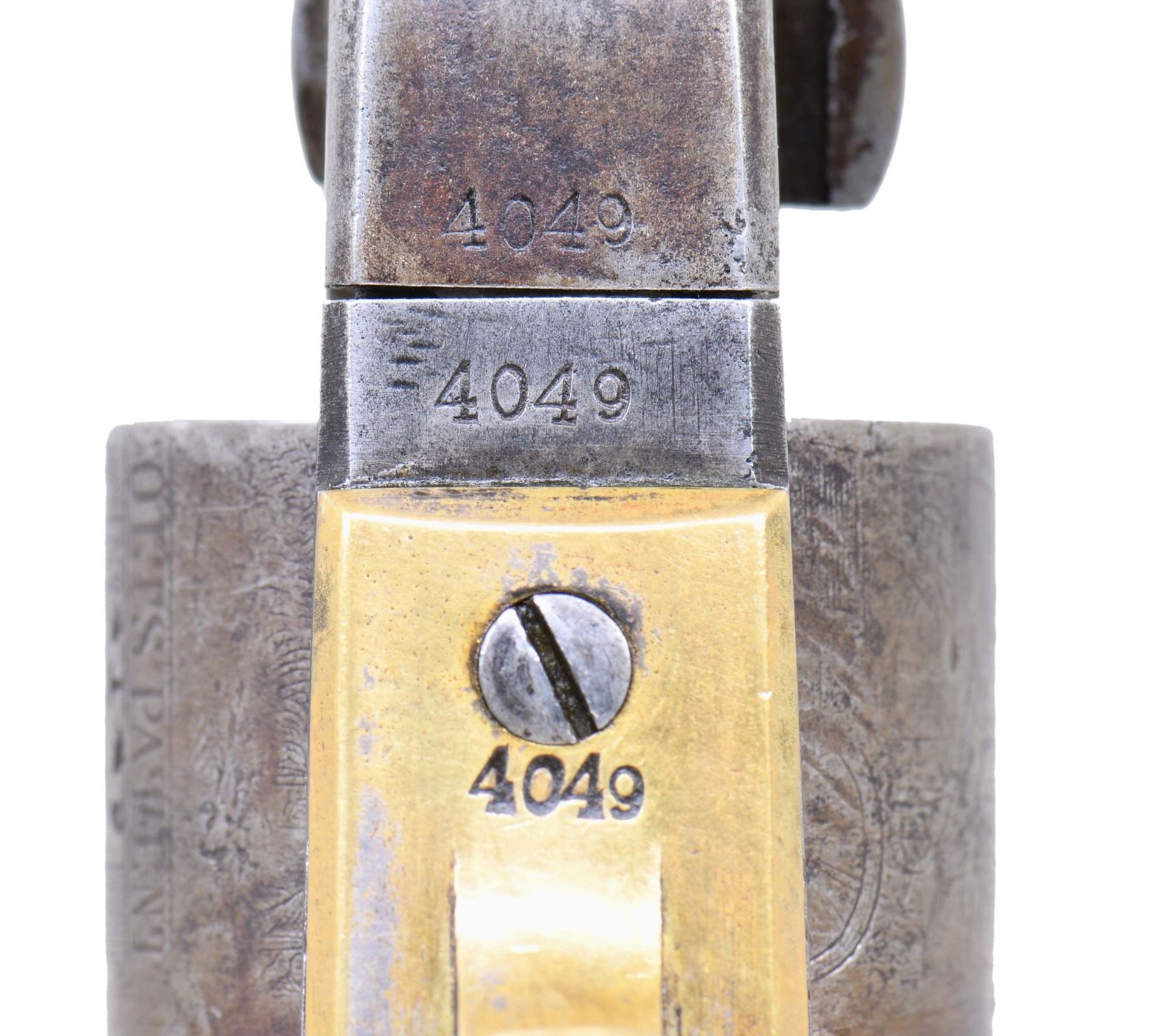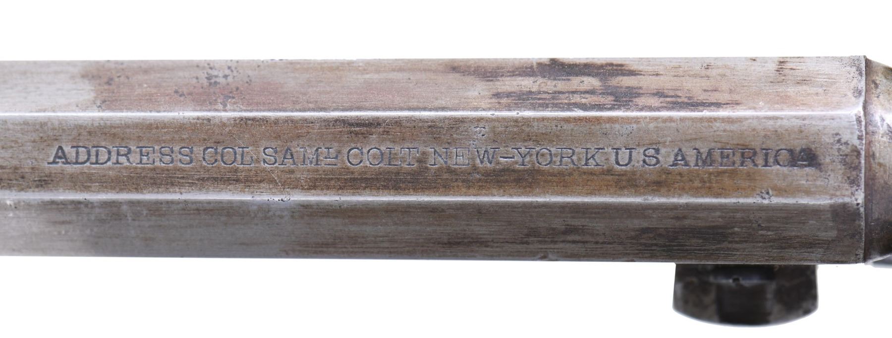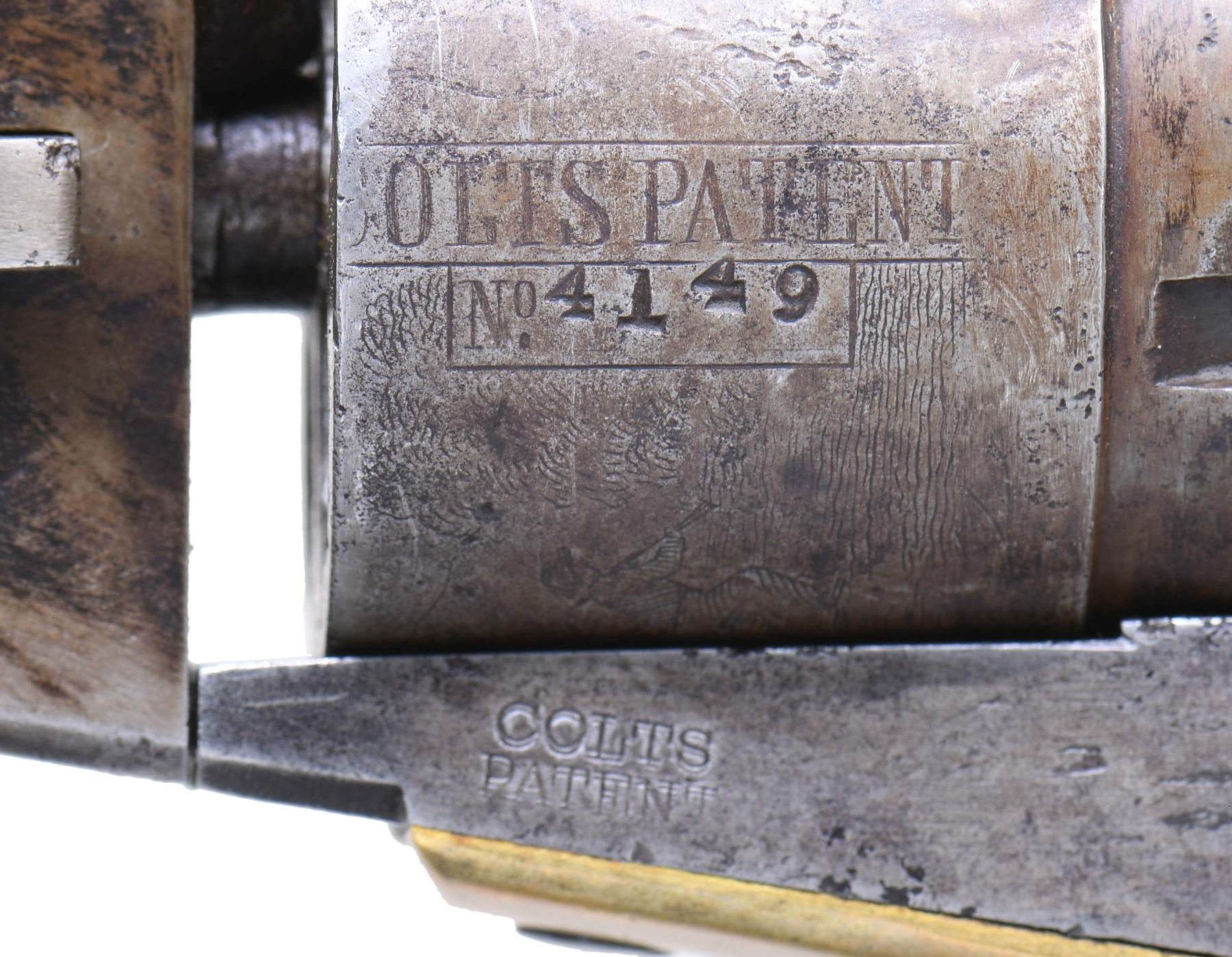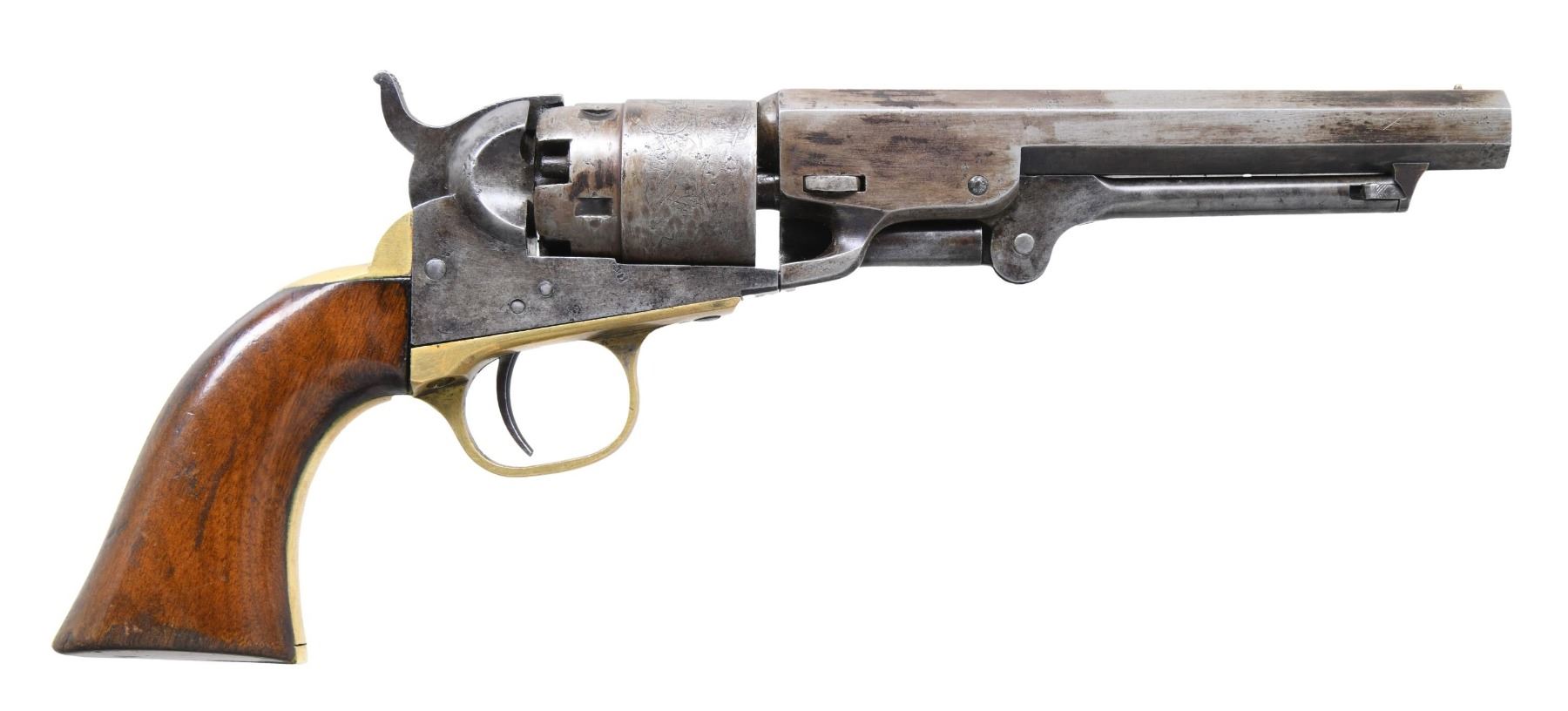 Cal. 36. S# 4049. Standard configuration made during Civil War in first year of production 1861, 5.5" octagonal barrel with 1-line NEW YORK US AMERICA address, small "COLT'S / PATENT" right side of frame, stagecoach holdup scene rolled 5-shot cylinder. Brass trigger guard and backstrap, varnished walnut grips. UNATTACHED ACCESSORIES: hand drawn colored collection card by Roger Ballard. CONDITION: very good overall, all matching and complete, metal is overall gray patina, barrel has been cleaned with traces of finish on bottom, most of "stagecoach holdup" cylinder scene visible. Mechanically fine, good rifled bore, grips retain most of their original factory varnish. PROVENANCE: Roger Ballard collection. (01-26582/JS). $800-1,200.