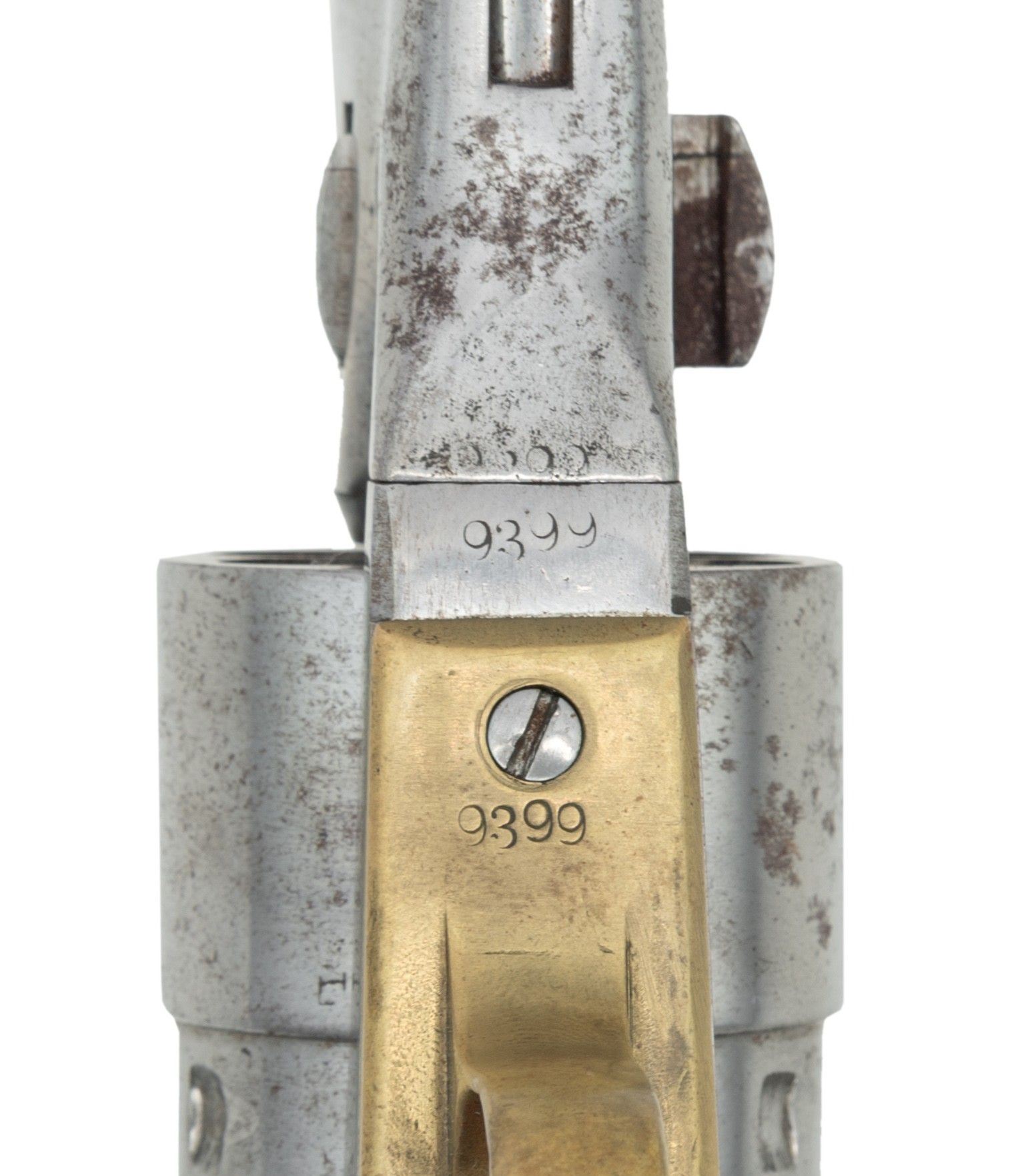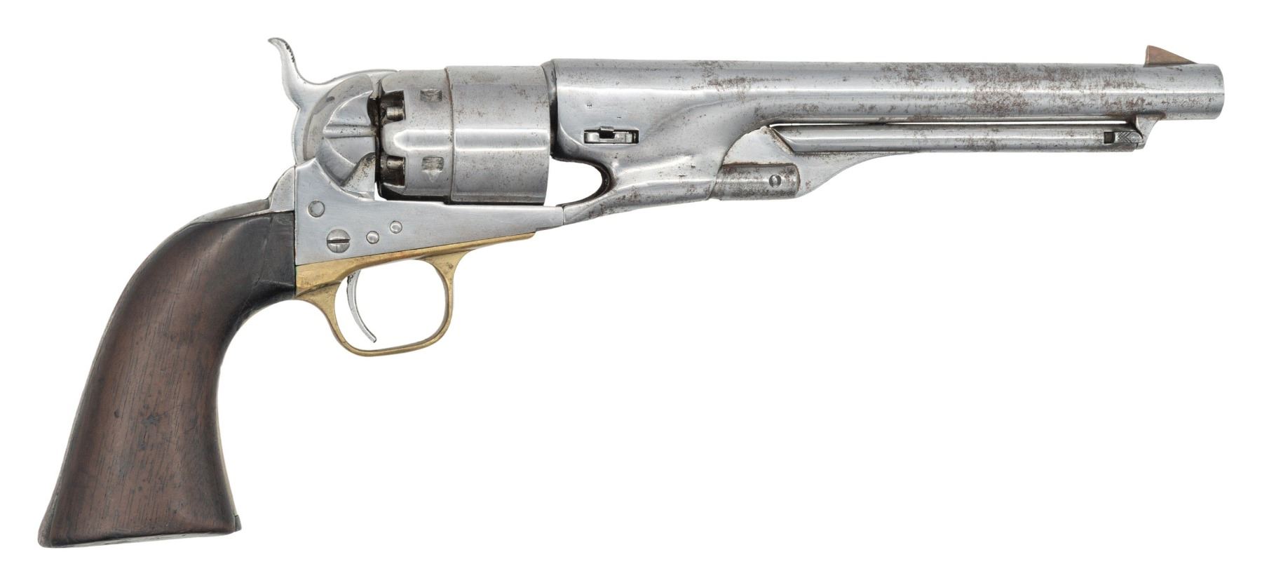 Cal. 44. S# 9399. Standard configuration of early martial 4-screw Colt 1860 army revolver, 8" round barrel, 4-screw frame made for shoulder stock, rebated cylinder, "COLT'S / PATENT" left side of frame. CONDITION: good overall, heavily buffed and cleaned removing address, making S#s partial and patent marking only partial, cylinder has mismatched S#, no cylinder scene, cartouche only seen in outline. Front sight is replaced brass blade. Mechanics fine, good rifled bore. PROVENANCE: Estate Collection of Nicholas Apergis. (01-27451/JS). ANTIQUE. $800-1,200.