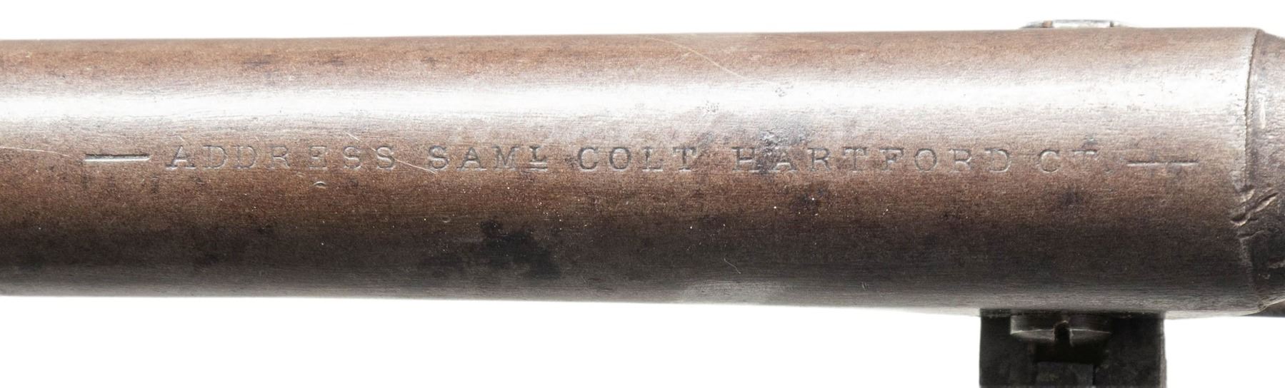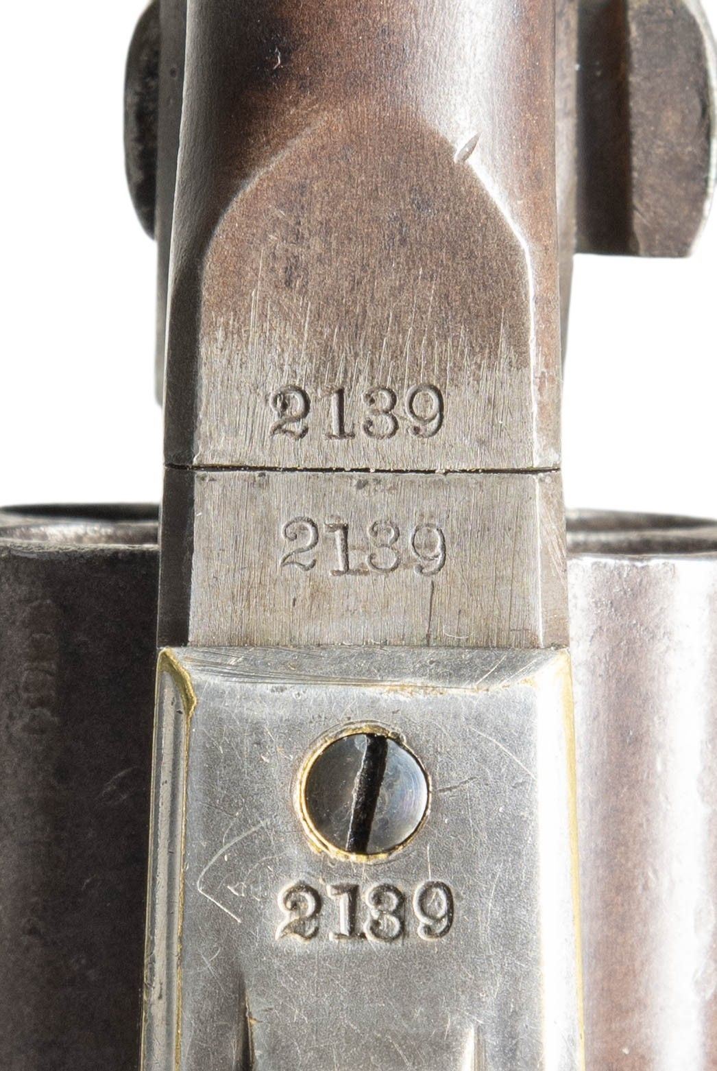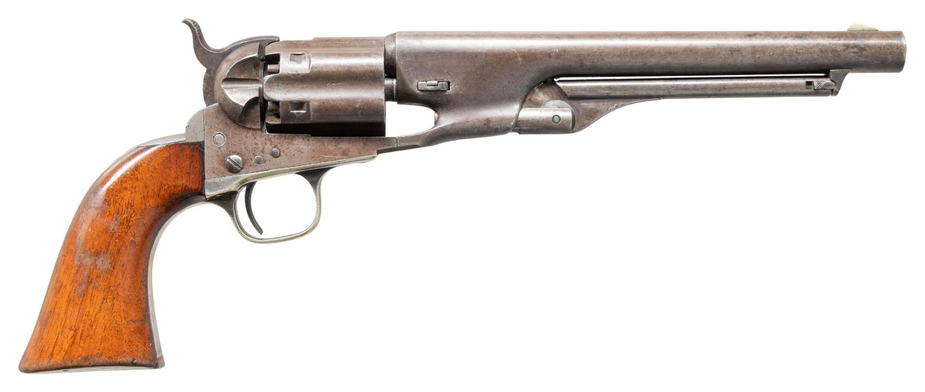 Cal. .44. S# 2139. Colt's new model army revolver was made to replace the heavier dragoon and was made concurrently in this serial range with the last dragoons in 1860. This revolver was shipped to Ohio governor, June 14, 1861. Standard configuration 4 screw frame made for shoulder stock & fluted cylinder, blue and case color finish, silver plated brass grip frame, varnished walnut grips. UNATTACHED ACCESSORIES: Colt archives letter. CONDITION: very good overall, "as found", all matching serial numbers including wedge, complete & original, full front sight, good markings, strong traces of bright blue finish in protected areas, overall mottled plum/gray patina, grips are sound, well fit retaining 80-90% original factory varnish. Mechanics are crisp, crisp rifled bore. PROVENANCE: Bob Allispones estate collection. (01-28674/JS). ANTIQUE. $4,000-6,000.