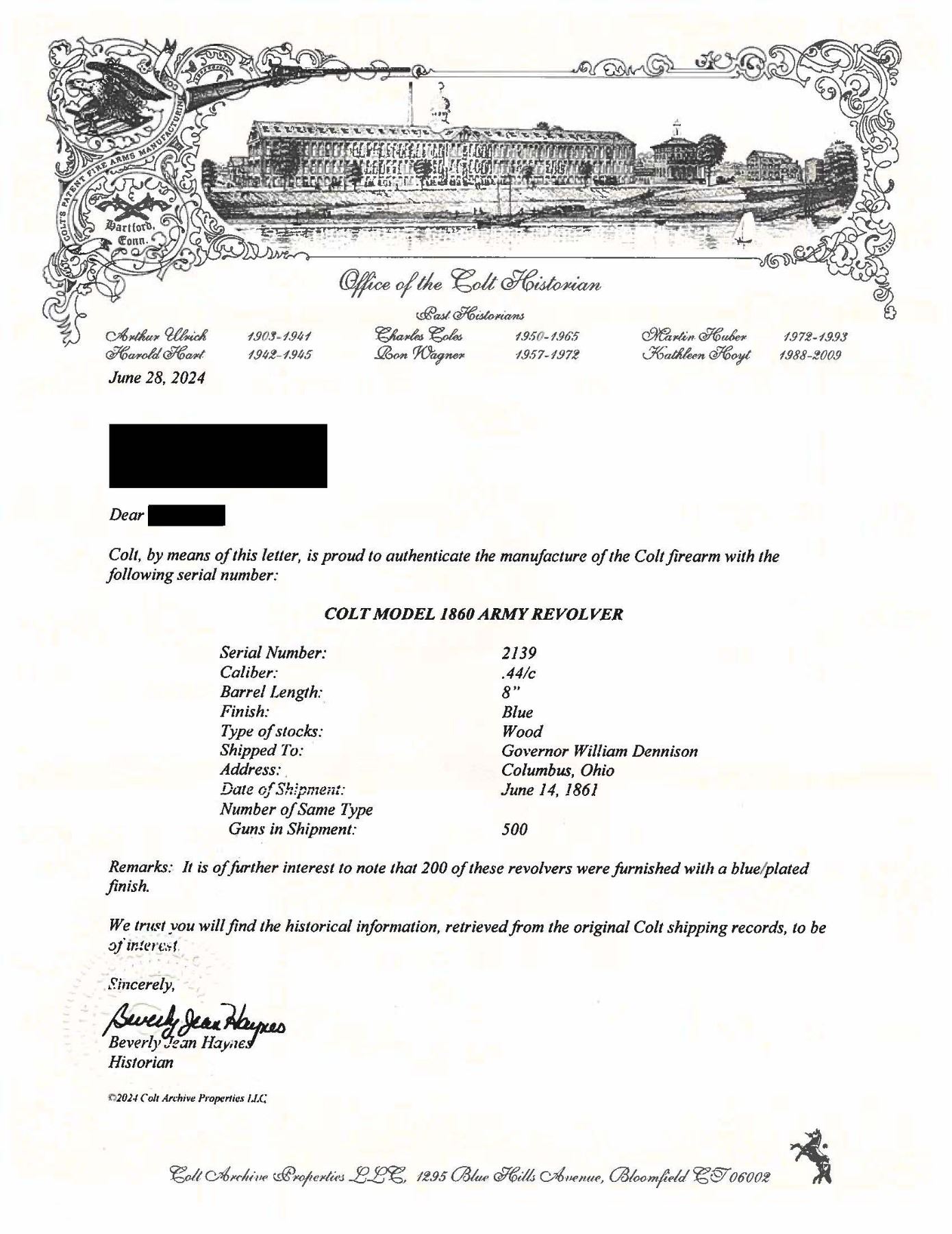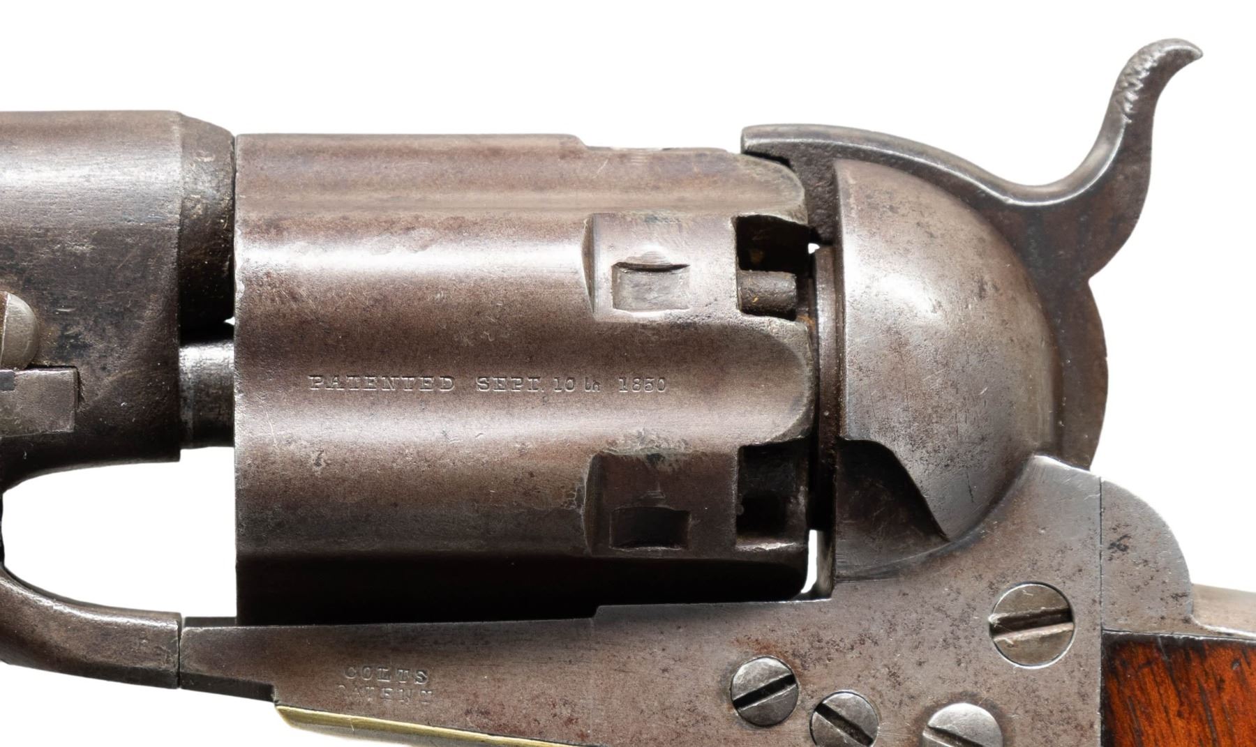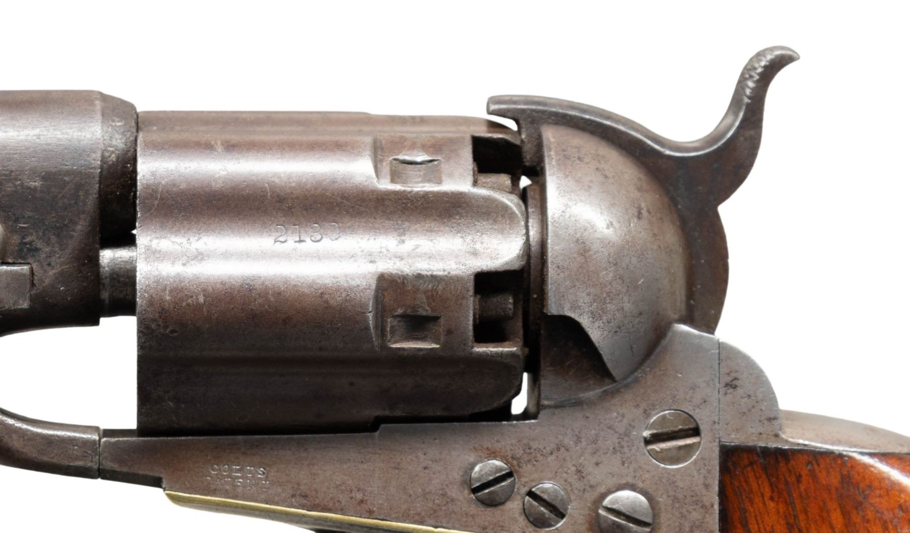 Cal. .44. S# 2139. Colt's new model army revolver was made to replace the heavier dragoon and was made concurrently in this serial range with the last dragoons in 1860. This revolver was shipped to Ohio governor, June 14, 1861. Standard configuration 4 screw frame made for shoulder stock & fluted cylinder, blue and case color finish, silver plated brass grip frame, varnished walnut grips. UNATTACHED ACCESSORIES: Colt archives letter. CONDITION: very good overall, "as found", all matching serial numbers including wedge, complete & original, full front sight, good markings, strong traces of bright blue finish in protected areas, overall mottled plum/gray patina, grips are sound, well fit retaining 80-90% original factory varnish. Mechanics are crisp, crisp rifled bore. PROVENANCE: Bob Allispones estate collection. (01-28674/JS). ANTIQUE. $4,000-6,000.