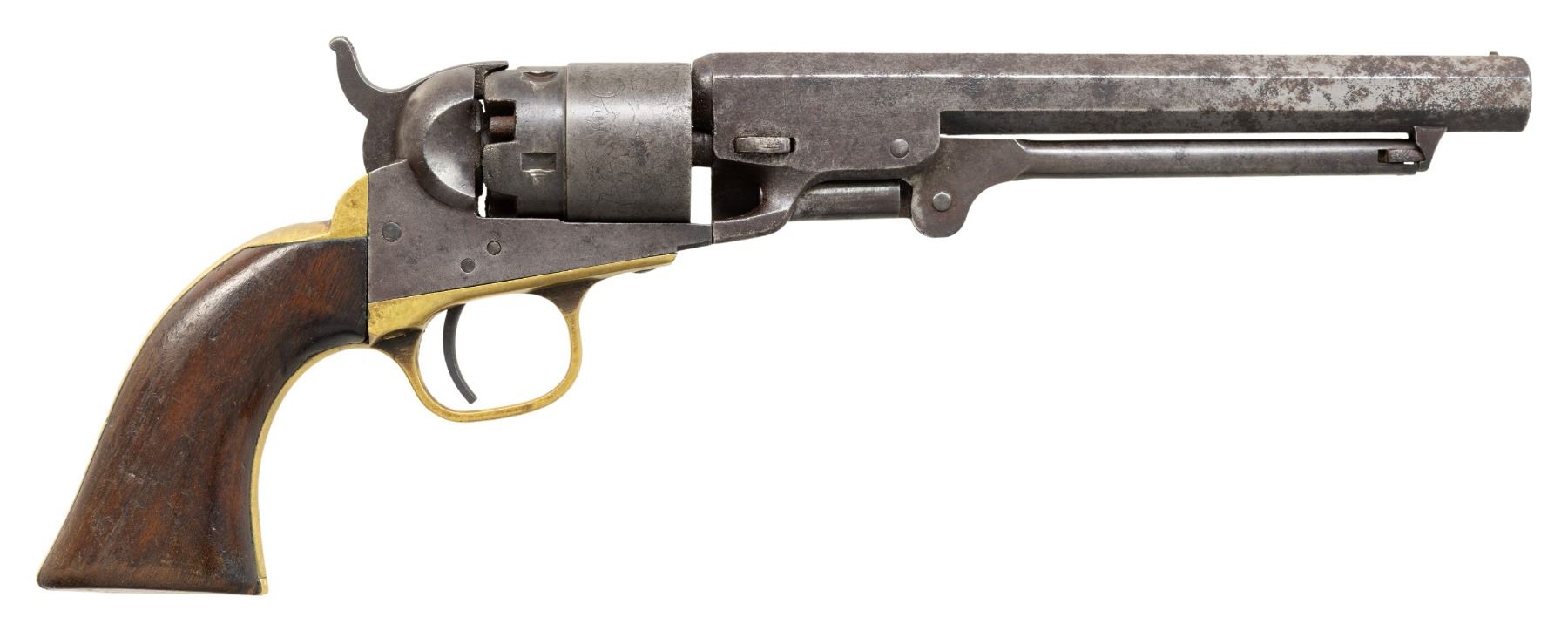 Cal. 36. S# 5959. Standard configuration made during Civil War in first year of production 1861, longest 6.5" octagonal barrel with 1-line" NEW YORK US AMERICA" address, small "COLT'S / PATENT" right side of frame, rolled stagecoach holdup scene 5-shot cylinder. Brass trigger guard and backstrap hold varnished walnut grips. CONDITION: very good overall, all matching and complete, most of "stagecoach holdup" cylinder scene visible, dark plum/gray metal, traces of finish. Mechanically fine, good rifled bore, grips retain about half of their original factory varnish. (01-27790/JS). ANTIQUE. $500-800.