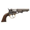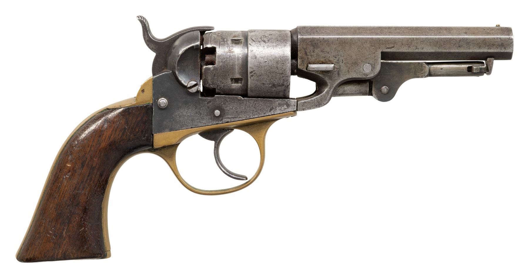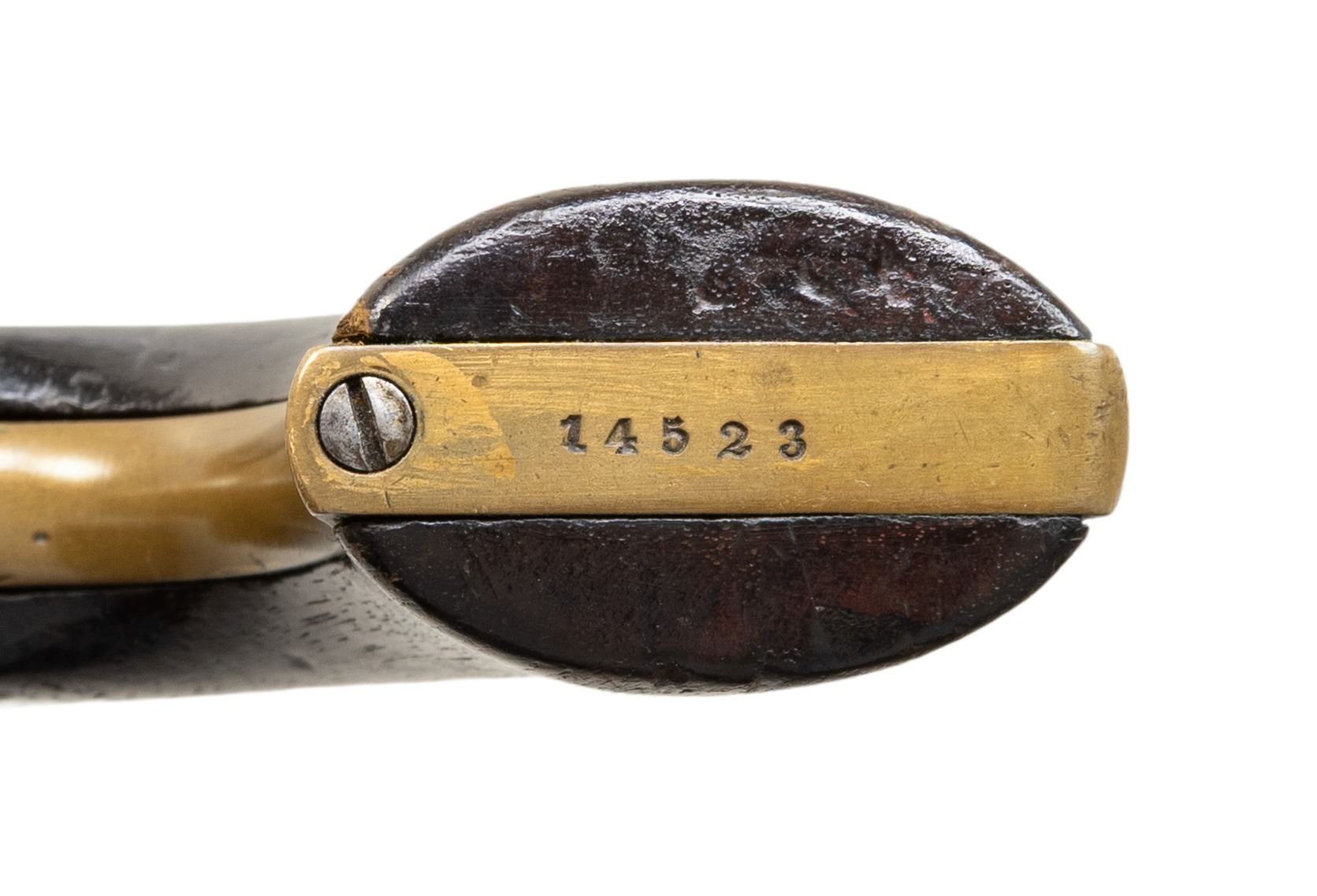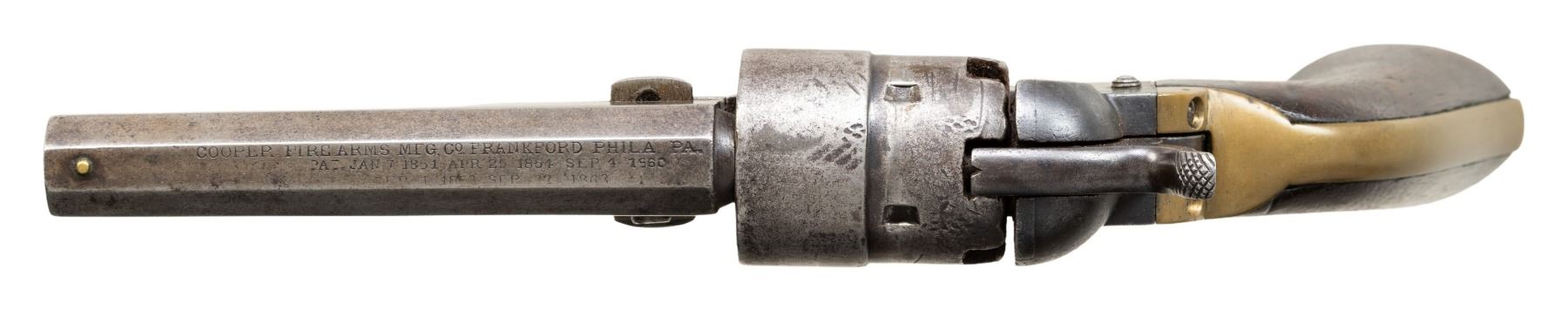 Cal. 36. S# 14523. 9.25" overall, 4" octagonal barrel with 3-line Philadelphia address, last patent date Sept. 22, 1863, brass grip frame, double action or single action, 5-shot cylinder, safety slots between nipples. CONDITION: good overall, appears complete & matching, grips retain traces original varnish, mechanics need attention, will not hold cock, good rifled bore with pitting. (01-28522/JS). ANTIQUE. $400-600.