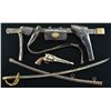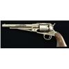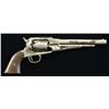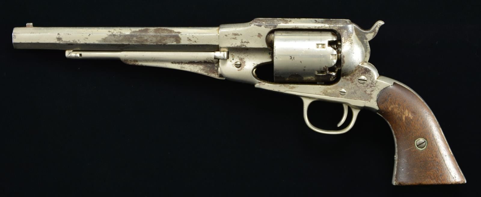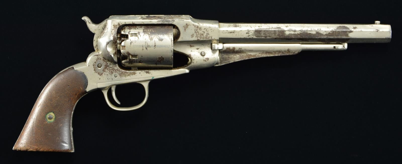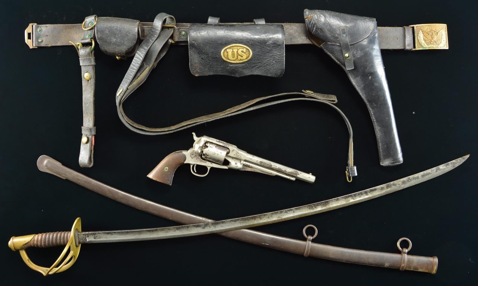 ARMY REVOLVER & MODEL 1860 CAVALRY SABER. Cal. 44. S# 65921. Bbl. 8”. Remington in standard military configuration, originally blued, now nickel plated, 2 piece grips, inspector’s cartouche on left. 1860 Cavalry saber made by “Mansfield & Lamb”. Bridle leather sword belt has nice enlisted eagle model 1850 buckle, holster, pistol cartridge box, cap box, sword hangers & over-the-shoulder strap. CONDITION: good overall, revolver has no discernible external markings due to plating, mechanically fine, good rifled bore. Saber has gray blade, last digit in date not readable, missing leather & wire wrap, sound scabbard. Leather is mix of original Civil War issue and reproduction holster & straps. Belt & buckle (matching benchmarks), cap box, & cartridge box are original. (01-22312/JS). ANTIQUE. $1,000-1,500.