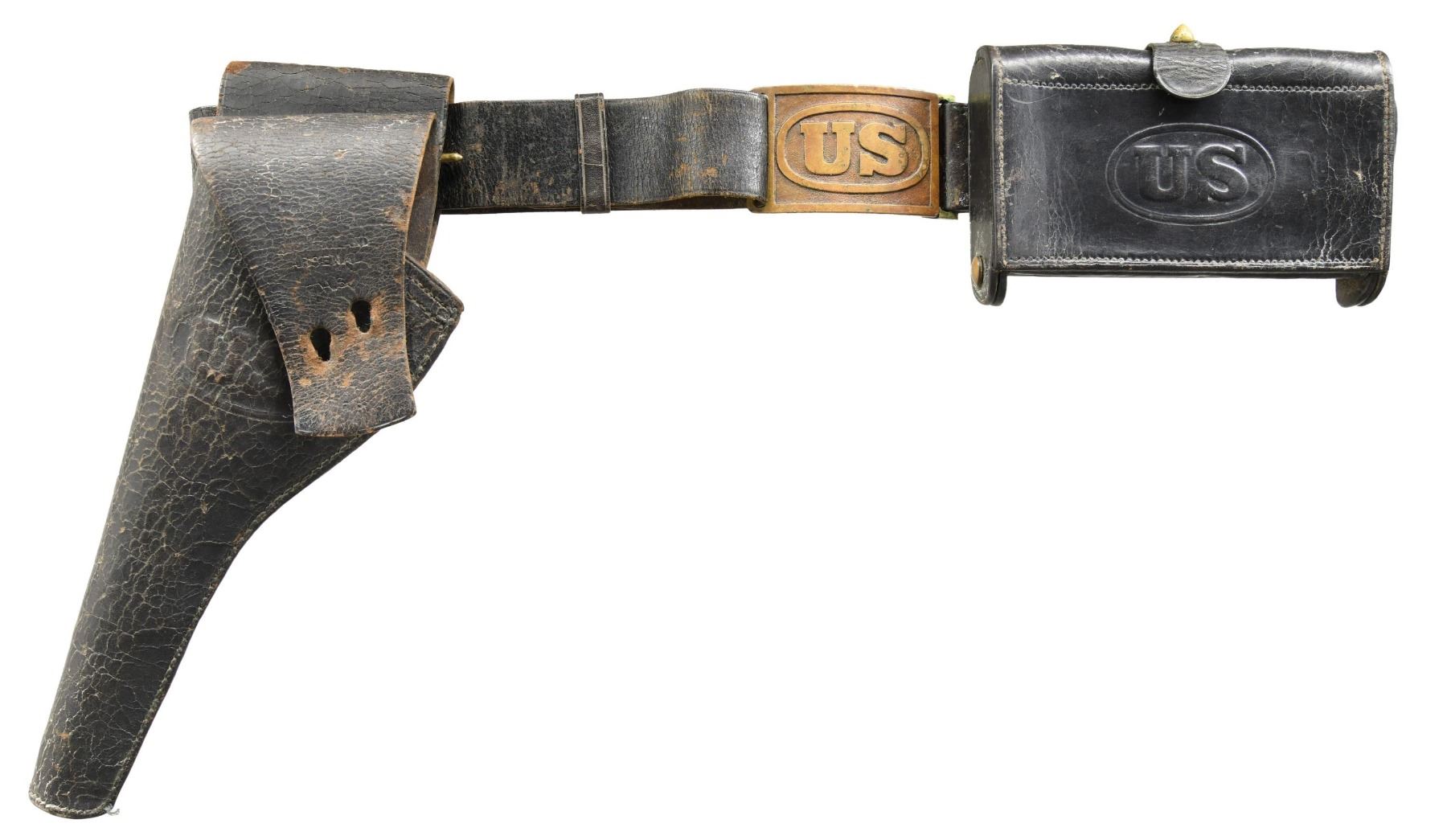 PERCUSSION REVOLVER WITH US BELT, HOLSTER, & CARTRIDGE BOX. Cal. 44. S# 94527. Bbl. 8". Model 1860 Army single action percussion revolver mfg. by Colt in 1863. The top of the bbl. is marked "-ADDRESS COL. SML COLT NEW-YORK U.S. AMERICA", with an "F" inspection proof marked on the left, and an "L" inspection proof marked on the right at the breech. Left side of frame is marked "COLTS/ PATENT". Cyl. is engraved with Colt's naval engagement scene and is stamped with "C" and "L" inspection proofs. Underside of trigger guard is stamped with a "W" inspector proof. Frame is mounted with a 1-piece smooth wood grip, which exhibits a faint inspector cartouche on either side. Brass trigger guard, with iron backstrap slotted on the butt for a stock attachment. German silver blade front sight. Nearly all numbers are matching and include the frame, cyl. base pin, cyl., trigger guard, backstrap, as well as the bbl. Bbl. wedge does not match, and is numbered "5379". UNATTACHED ACCESSORIES: Model 1874 US brown leather belt with a Rock Island Arsenal Model 1881 brown leather holster, as well as a Rock Island Arsenal McKeever Model 1881 Cartridge box. CONDITION: iron components retain scant traces of their original factory blue finish, with the balance retaining a dark gray patina, exhibiting areas of mild to moderate surface level pitting, with scattered spots of age related discoloration present overall. Brass trigger guard appears to have been cleaned at one time, exhibiting some scattered spots of age related discoloration. Bright bore, exhibiting scattered spots of dark pitting, while retaining well defined rifling throughout. Action functions appropriately when cycled by hand, and holds at both half and full cock. Grip shows scattered marks and impressions from handling and storage, with a few small chips and a crack present on the left side. Butt and bottom of grip exhibit numerous small impressions and dings. Leather belt, holster, and cartridge box remain malleable, with all exhibiting appropriate age related cracking and crazing, while remaining sturdy and serviceable. Brass fittings exhibiting a pleasing mellow patina, with some scattered spots of verdigris. (01-25468/MLW). ANTIQUE. $1,000-1,500.