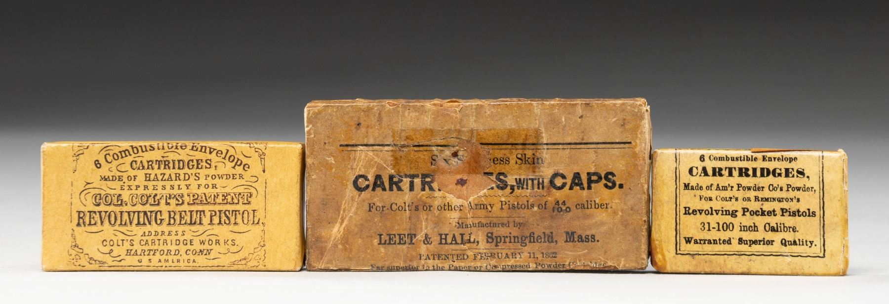 COLT REVOLVERS. 1). Very nice sealed pack of 6 cartridges for 31 caliber Colt or Remington Pocket Revolvers. 2). Exceptional sealed pack of 6 Colt 44 cartridges for 1860 Army revolver. 3). Good partial (4 of 7) pack of Leet & Hall 44 cartridges for 1860 Army revolver. Original package with aged cellophane tape for partial sealing. "Patented February 11, 1862" marked along with "CARTRIDGES, with CAPS". PROVENANCE: The Esteemed Norm Greenberg Collection. (02-24841-15/NW). $650-900.