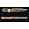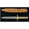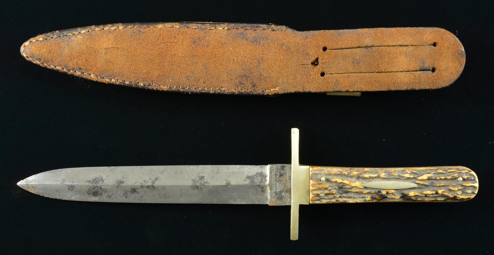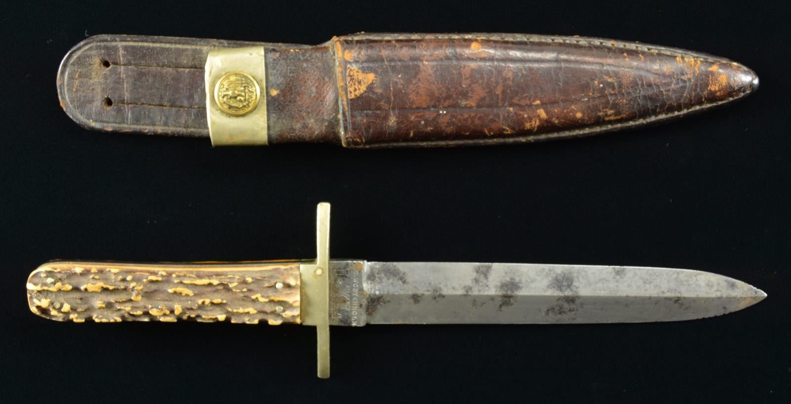 10”overall, 6” blade with central medial ridge, signed “GEO. WOSTENHOLM / I*XL”, cast 2.5” German silver cross guard, stag grip slabs, original Sheffield red leather veneered pasteboard sheath is housed in leather sheath with integral belt loop, small US navy button in place of original frog button. CONDITION: very good overall, blade has some original luster, stained & pitted. (02-17903/JS). $400-600.