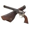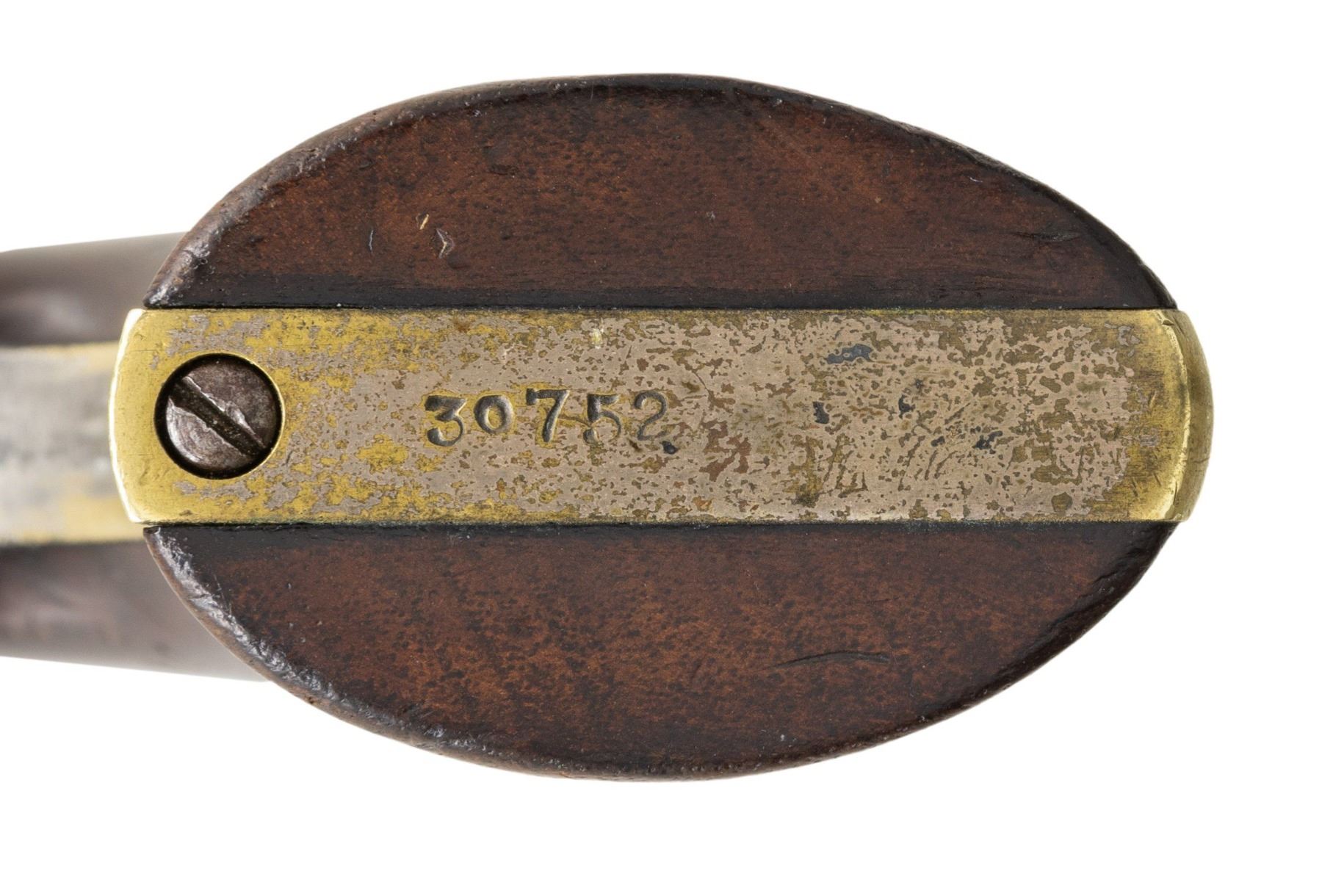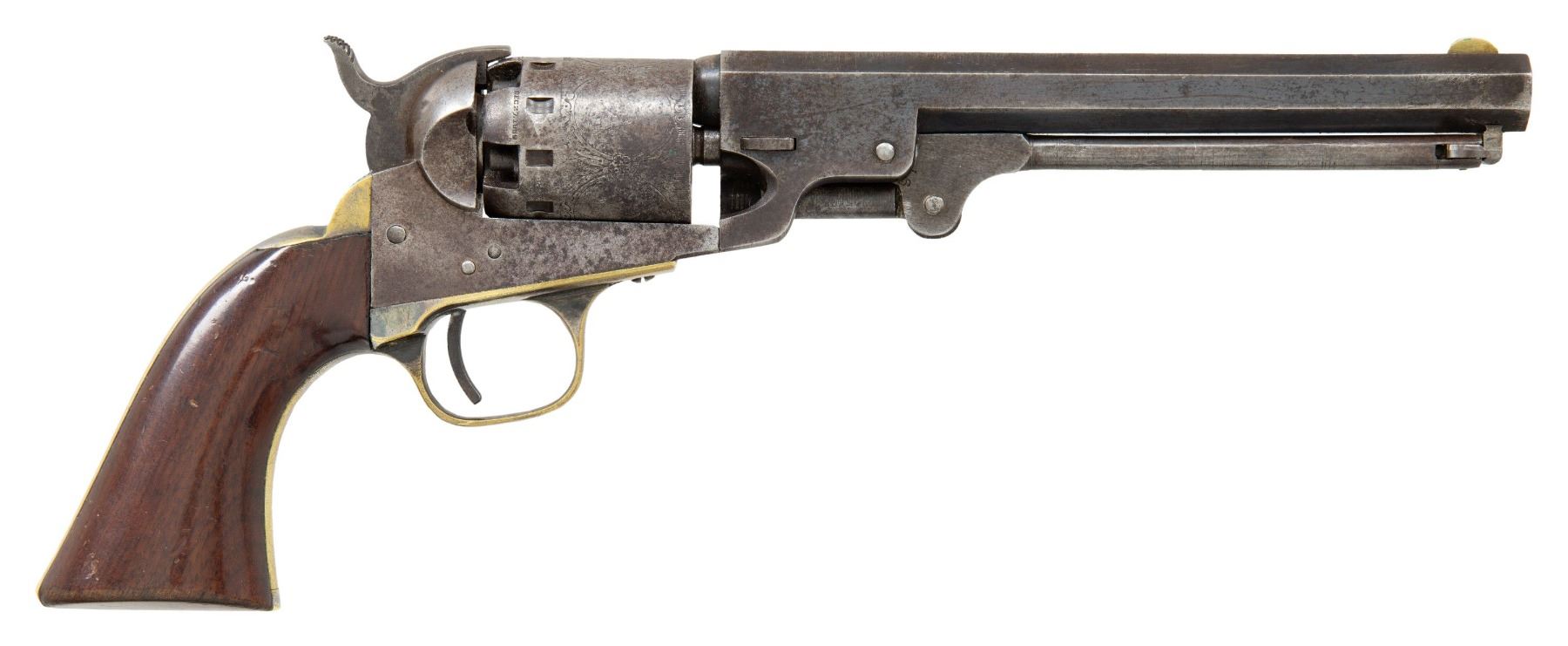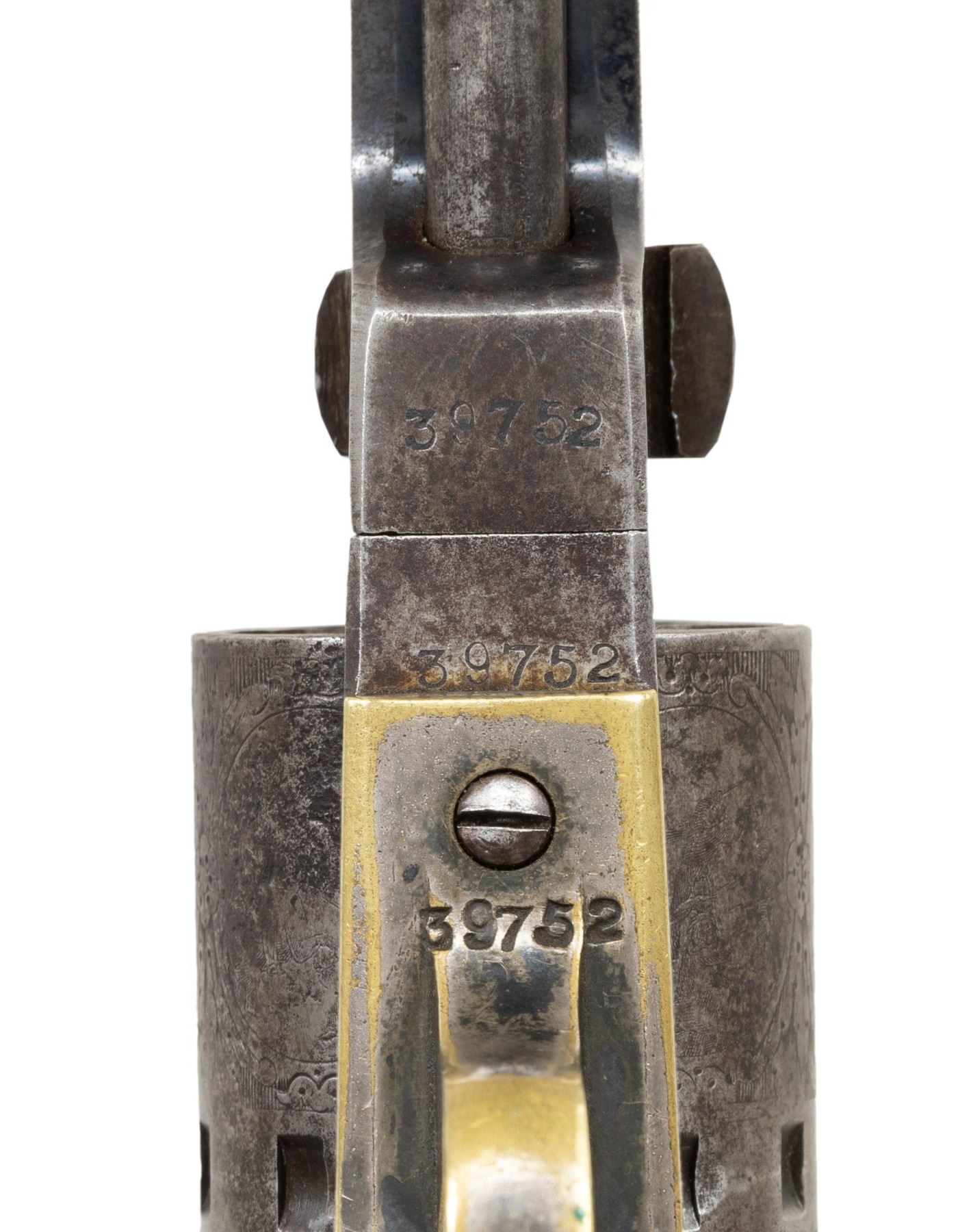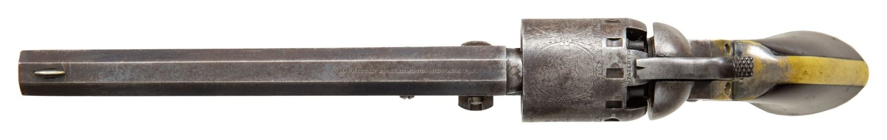 REVOLVER & HOLSTER. Cal. 36. S# 39752. Standard configuration, scares and longest 6.5" octagonal barrel stamped on top flat: "MANHATTAN FIREARMS CO. NEWARK NJ", German silver blade front sight; 5-shot, 11 stop cylinder is unique to Manhattan design. Cylinder is roll engraved with 5 different panel scenes and stamped "PATENTED DEC 27, 1859". CONDITION: very good overall fine, all matching and complete, barrel retains 30-40% blue finish, stamped markings are crisp, grip strap retains about half its original silver plate, grips retain about 70-80% original varnish. Mechanics are fine, good crisp rifled bore. Accompanying tooled brown leather holster has had military style flap cut off. PROVENANCE: Bob Alispones estate collection. (01-28679/JS). ANTIQUE. $1,200-1,500.