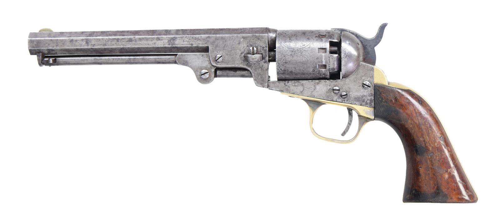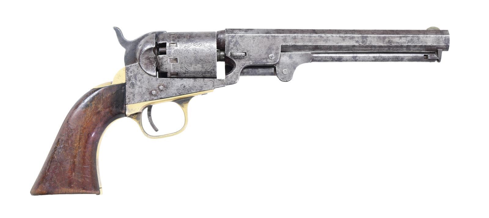 MODEL SERIES II SINGLE ACTION PERCUSSION REVOLVER INSCRIBED TO JOSEPH W. STEARNS WITH PROVENANCE. Cal. 36. S# 13385. Bbl. 6 1/2". Series II Navy Model single action percussion revolver mfg. by Manhattan Firearms Mfg. Co. circa. 1860-1861. Top flat of the octagonal bbl. is marked with Manhattan Firearms Mfg. Co.'s single line address. Cyl. is engraved with 5 panel scenes. Rear grip strap is engraved "Joseph W. Stearns 2nd Regt O.Vols by his friends", indicating presentation to Joseph W. Stearns of the 2nd Ohio Volunteer Cavalry Regiment. Iron construction with brass trigger guard and rear grip strap. 1-piece smooth wood grip. German silver blade front sight with hammer notched rear sight. All numbers are matching and include the frame, cyl. base pin, cyl., bbl., bbl. wedge, trigger guard, as well as the backstrap. UNATTACHED ACCESSORIES: various forms of provenance with some examples including Joseph Stearns' Volunteer Enlistment form, Casualty Sheet, Certificate of Disability for Discharge, as well as a letter written by Stearns' to his mother. CONDITION: iron components exhibit a mottled gray patina, with areas of light to mild pitting, as well as spots of darker discoloration present overall. Trigger guard and backstrap appear to have been cleaned at one time, with the trigger guard retaining some traces of its original silver plated finish. Bright bore, exhibiting scattered areas of moderate dark pitting, while retaining fair to good rifling throughout. Action cycles, but does not index properly. Grip exhibits scattered marks and impressions from handling and storage, as well as some wear and flaking to the varnish, but otherwise remains sturdy and serviceable. A nice identified Manhattan Firearms Mfg. Co. Navy revolver with extensive provenance. PROVENANCE: from the Lifelong Collection of Robert "Mike" Bricker. (01-24961/MLW). ANTIQUE. $1,000-2,000.