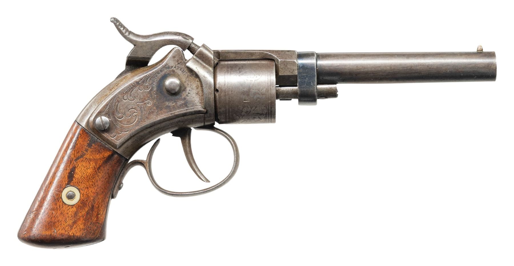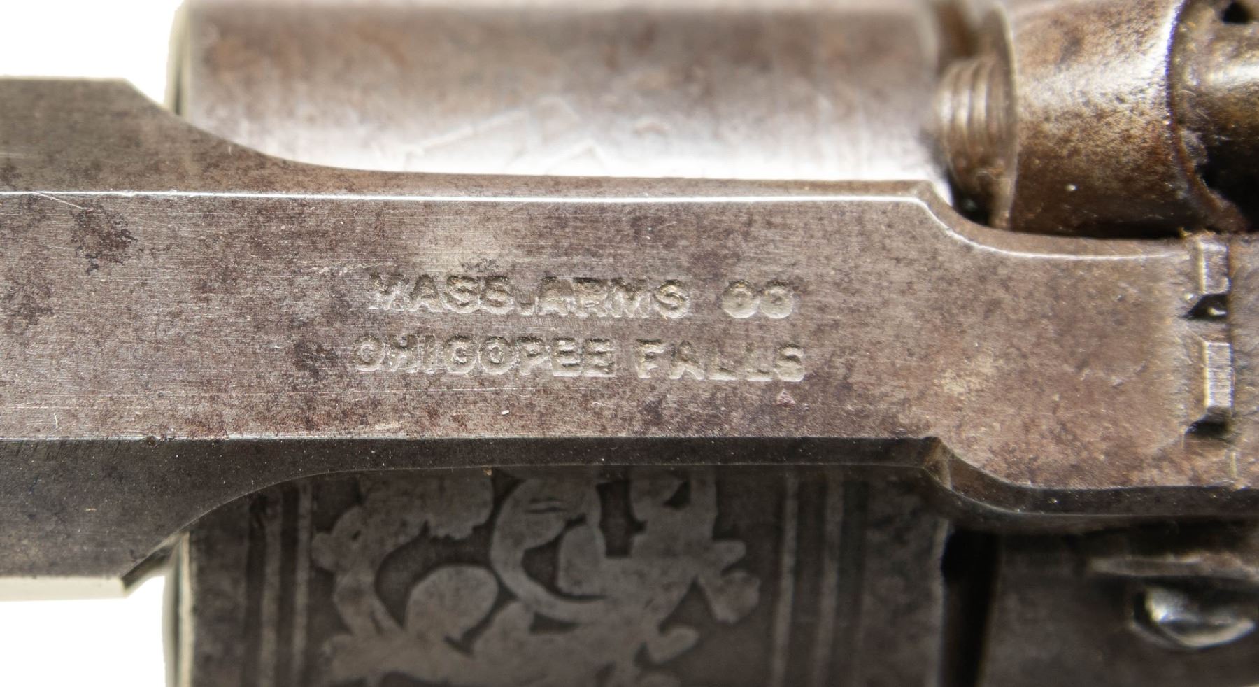 POCKET REVOLVER. Cal. 31. S# 309. Standard configuration. 7.75" overall, 3.5" barrel. Hinged barrel latch & barrel assembly. Backstrap "PATENT / JAN. 2, 1855", top strap "MASS ARMS CO. / CHICOPEE FALLS". Frame has sliding tape primer door: "MAYNARD's PATENT" over large eagle over "SEP 22 1845". Matching assembly marks on barrel, cylinder, and trigger guard. CONDITION: good to very good, original & matching, good markings, strong traces of blue finish. Mechanics need attention, won't hold cock, good rifled bore. (01-28505/JS). ANTIQUE. $500-800.