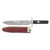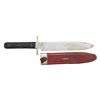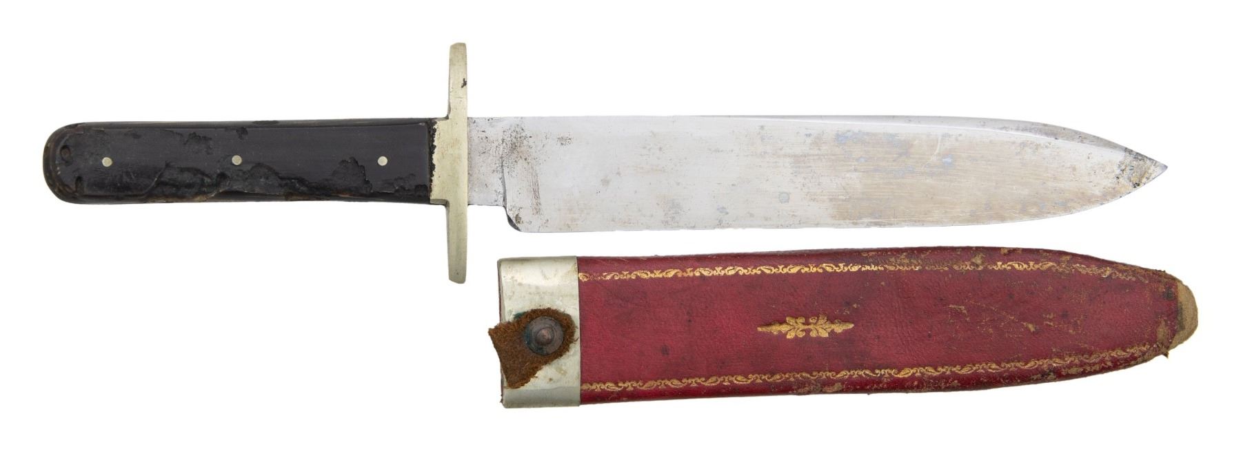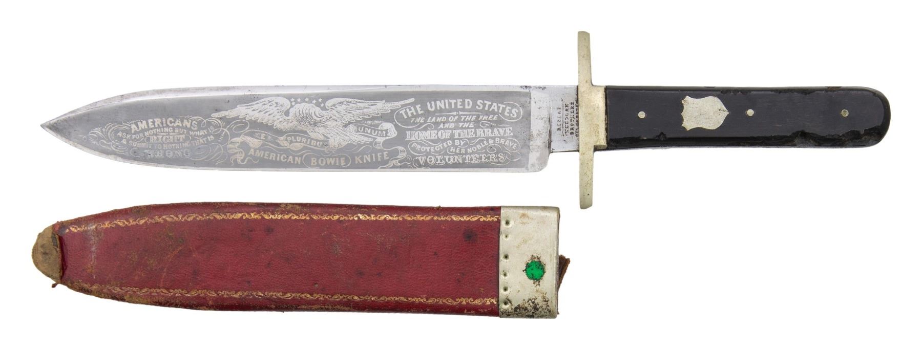 KNIFE". 11" overall, 7" spear point blade fully etched with patriotic American mottos so popular among Union soldiers early in the war. The bright etched blade has a large American eagle and "AMERICAN BOWIE KNIFE" along with other patriotic mottos. Ricasso is Sheffield maker marked Needham Brothers, full tang, German silver mounted, horn slab grips. CONDITION: the blade is fine overall retaining most of its original polish and luster and bright etch, slight bend to tip. Horn slabs have heavy insect damage, gilt decorated red composite sheath is missing tip, frog button has been altered for longer use with riveted belt loop which is torn off. PROVENANCE: Norm Flayderman family collection. (02-24506/JS). NON-GUN. $1,500-2,000.