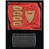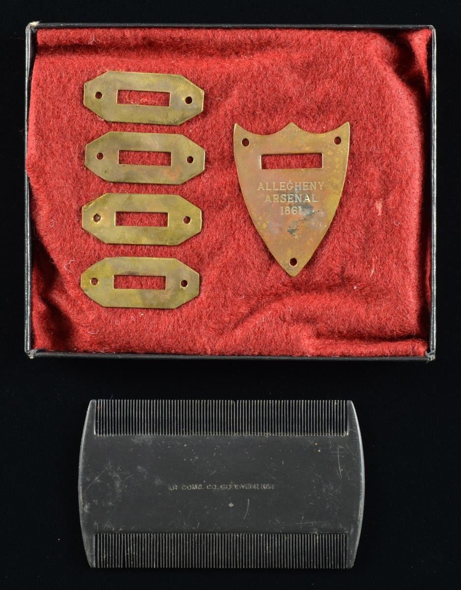 This group includes a Yankee saddle shield marked “ALLEGHENY ARSENAL 1861” with holes at the 3 points. / 4 Brass slot covers for a saddle with a central rectangular hole and 2 round attachment holes at the top and bottom of each. / 1 Hard rubber lice comb marked “I.R COMB. CO. GOODYEAR 1851”. Amazingly, the comb has no missing teeth. CONDITION: shield & slot covers show light wear. Comb is a bit dirty but undamaged. (02-17475/BF). $100-200.