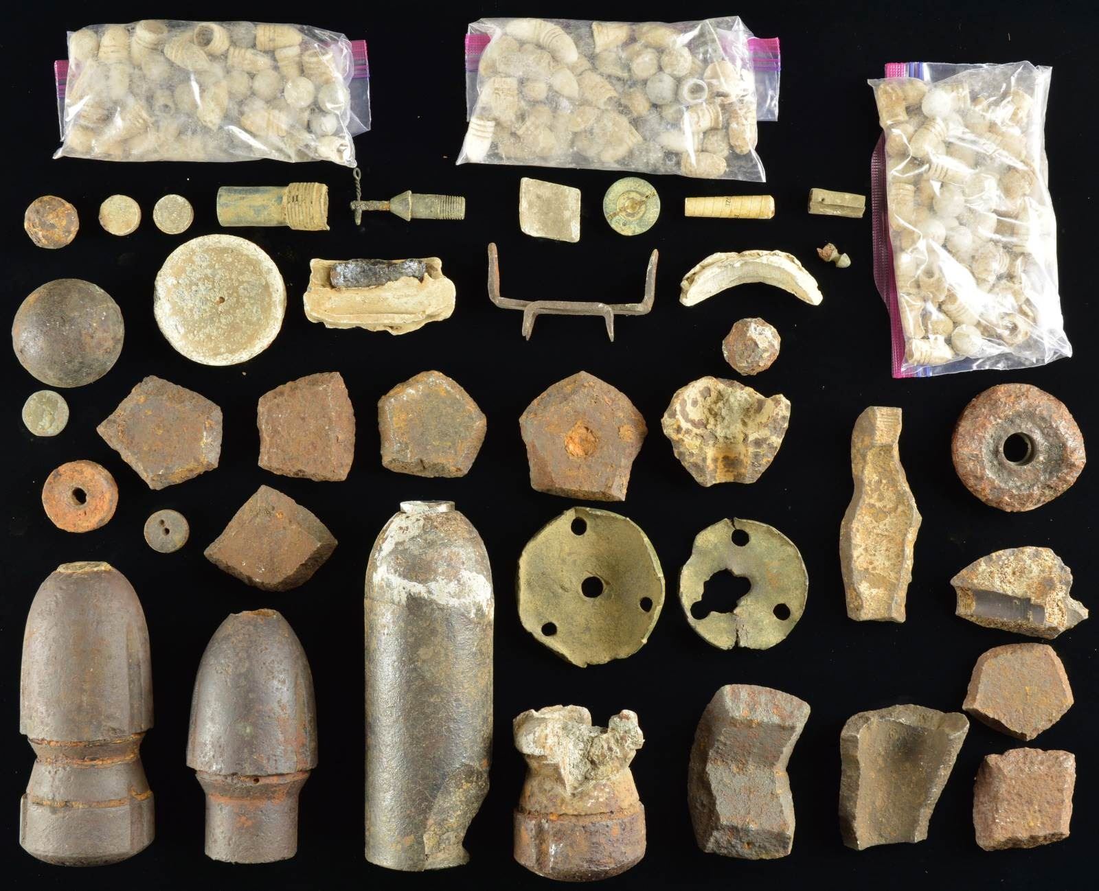 BULLETS. This group includes 146 excavated round balls & mini balls of the Union & Confederacy. Bullets are both fired & unfired examples. / 1 Excavated ice creeper. / 2 Sections of lead sabot. / 1 Round lead sabot. / 6 Artillery fuses. / 2 Canister shots. / 1 Finial. / 1 Coin. / 1 Piece of bar lead. / 1 Cannonball measuring 2 1/2". / 14 Pieces of exploded artillery shell. / 2 Brass sabots. / 1 Hotchkiss shell with fuse intact. / 1 Partial Hotchkiss shell. / 1 Base of a Hotchkiss shell. / 1 Union parrot shell with a confederate fuse in the top. CONDITION: bullets generally have an excavated white powdery patina. Shell fragments & shells have an oxidized overall patina. (02-16905/BF). $500-700.