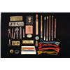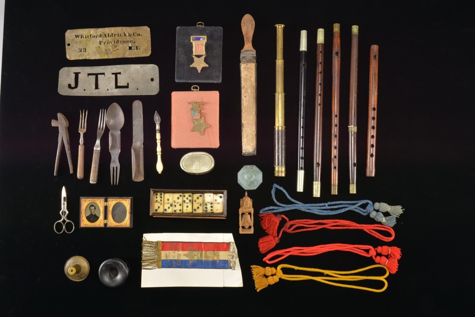 & MORE. This varied lot includes 3 Civil War era fifes w/ metal ferrules at each end. / 1 2 piece Civil War fife w/ a central metal ferrule. / 1 Carved wooden fife. / 1 Set of 28 bone dominoes in a wooden box. / 1 Umbrella ink well w/ an open pontil. / 1 Carved soldier’s whimsy in the shape of a bell tower. / 1 Set of stencils. / 1 Hard rubber desk inkwell. / 1 German silver snuff box. / 1 Bobeche. / 1 Pair of nail pulling pliers. / 1 Pair of scissors. / 1 Sm. 4 section spy glass. / 1 Razor sharpening strop. / 1 Thermoplastic case w/ 2 ambrotypes inside showing a gentleman in civilian clothes & a soldier, in poor condition. / 1 Bone handled ink scraper. / 1 Fork. / 1 2 Piece Richard’s Patent mess knife, fork & spoon set. / 1 1864 Stamped envelope from the US Christian Commission. / 1 Musket worm. / 1 GAR reunion badge from Walton, NY. / 3 GAR membership badges. / 8 Stencils w/ company or individuals’ names. / 2 Civil War Artillery Hardee hat cords. / 1 Civil War Infantry Hardee hat cord. / 1 Civil War Cavalry Hardee hat cord. CONDITION: all items show light to moderate wear except as noted. Domino set is complete. GAR badges have their ribbon. (02-14211/BF). $600-900.