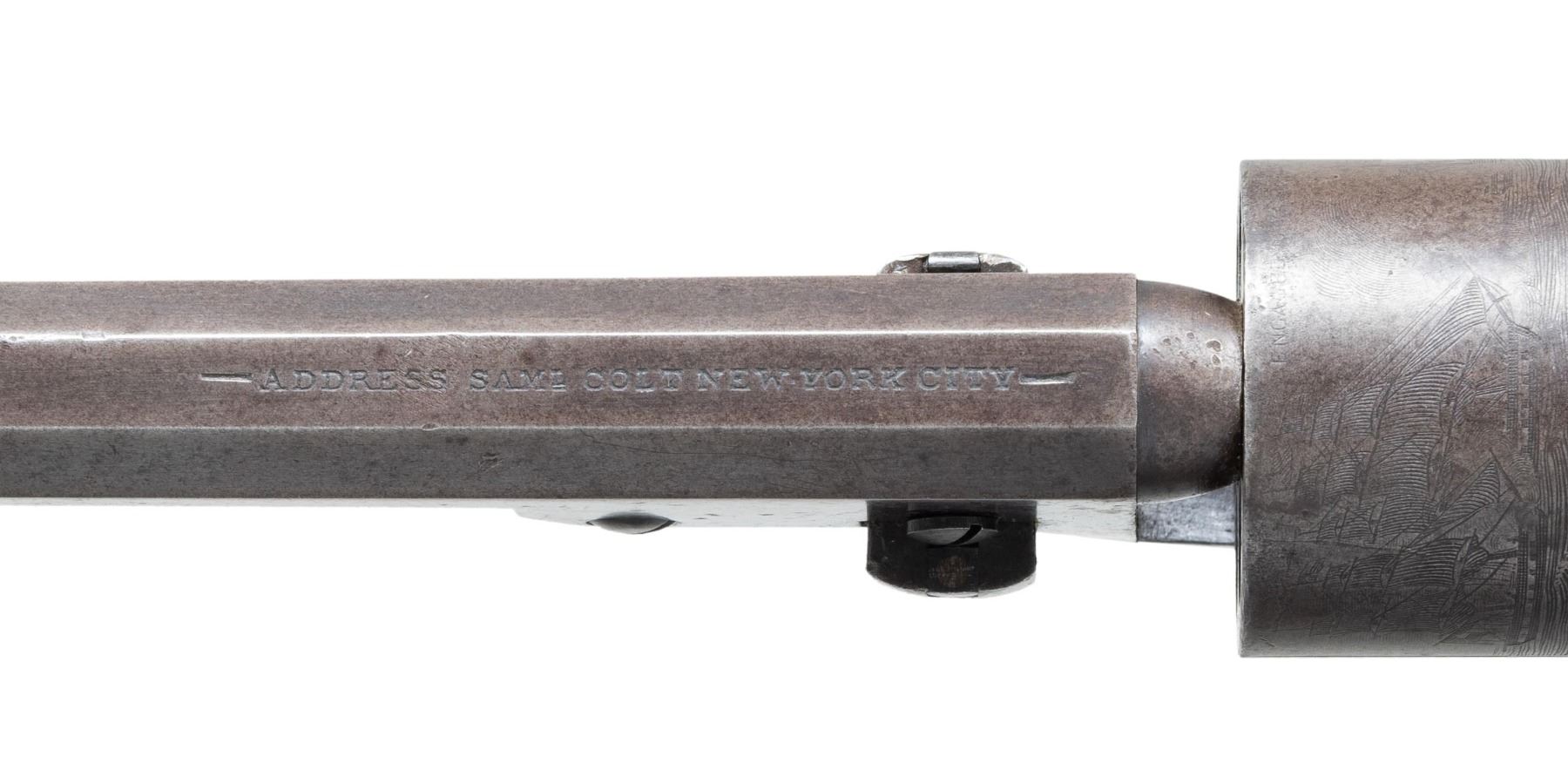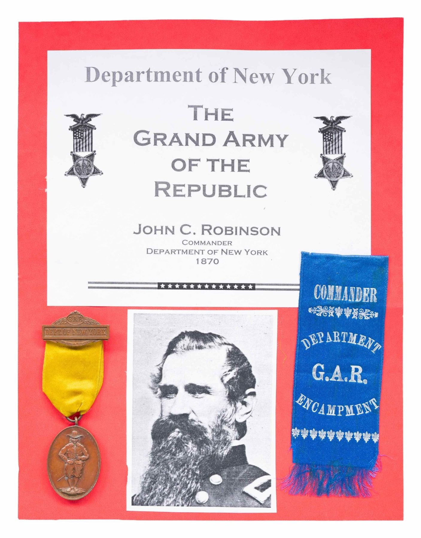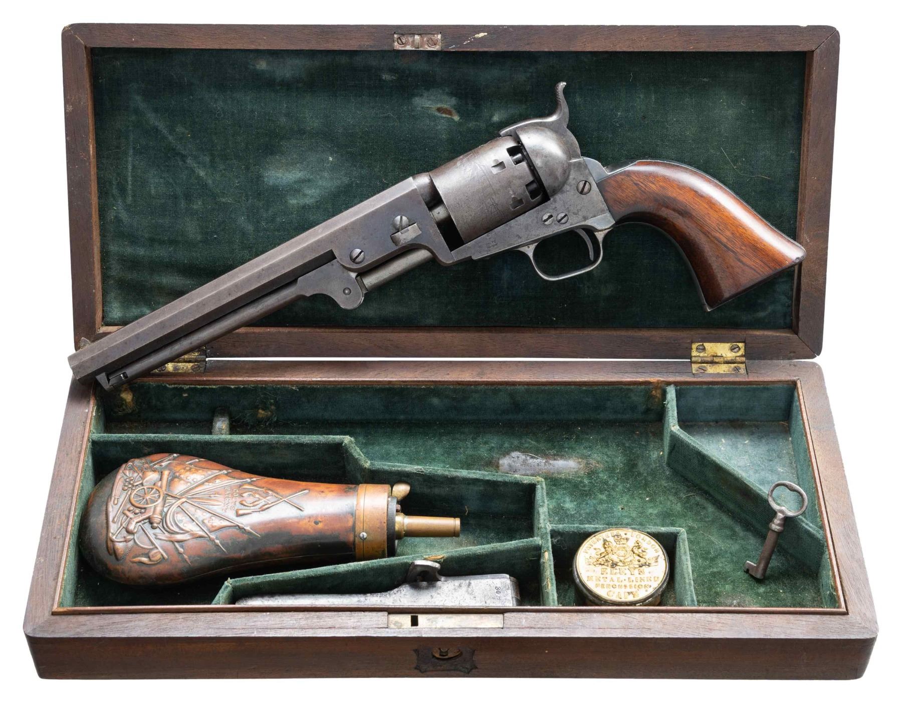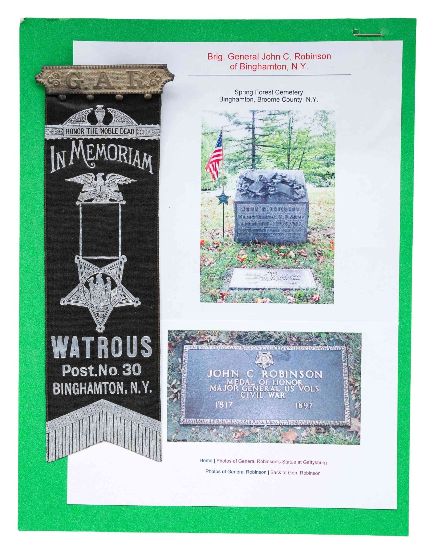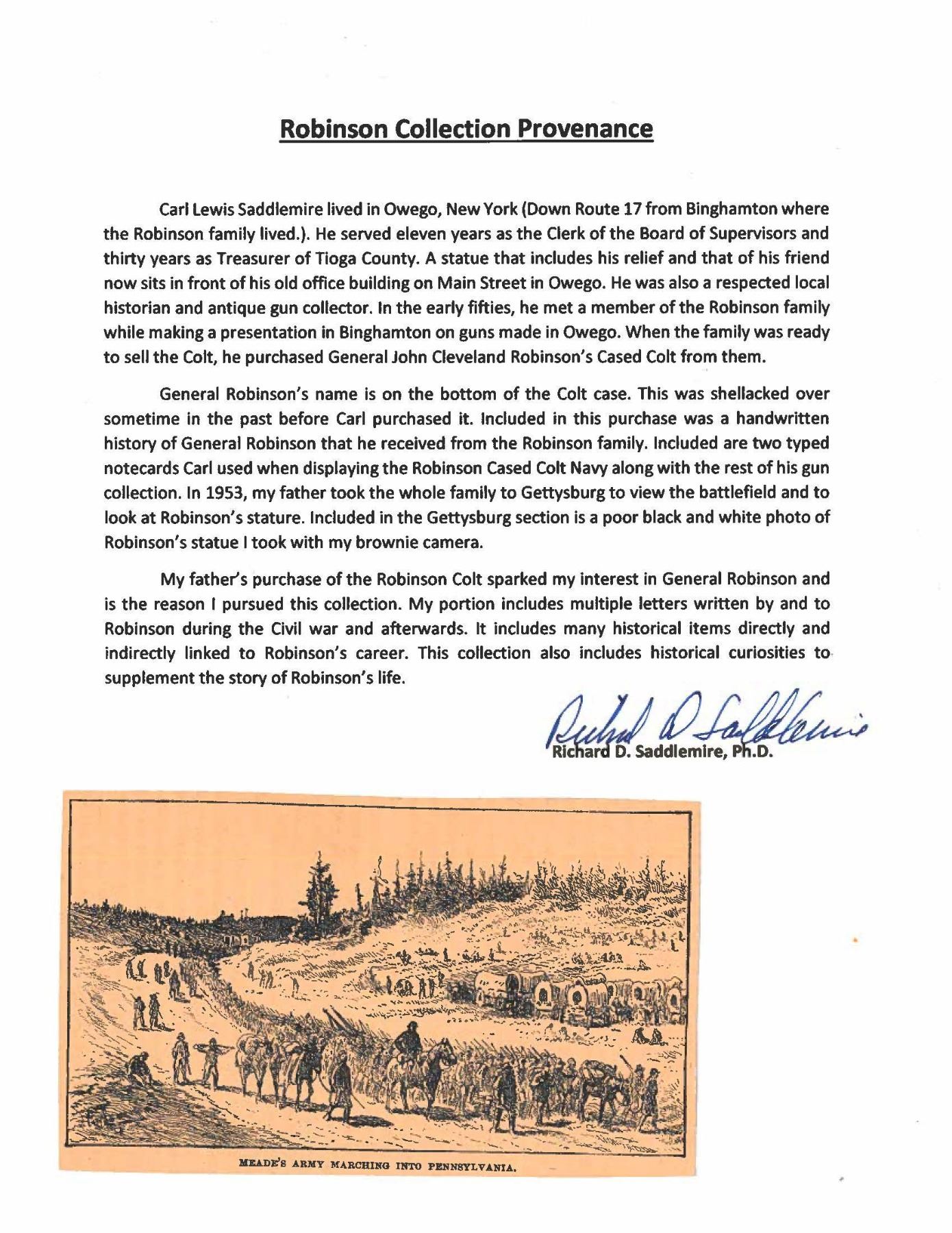 REVOLVER & MASSIVE MEMORABILIA ARCHIVE, MEDAL OF HONOR RECIPIENT. Cal. 36. S# 10225. General John Cleveland Robinson (1817-1897) had incredible military career after leaving West Point in 1838, through Seminole Wars, Mexican War, Civil War being awarded congressional medal of honor and losing his leg in 1864, headed Freedmen's Bureau in North Carolina, commander of Department of the South, retired from army May 6, 1869 with rank of Major General, later commander-in-chief of Grand Army of Republic, and Lieutenant Governor of New York. There is a full length bronze statue of Robinson on Gettysburg battlefield at intersection of Robinson & Doubleday Avenues. This archive has large file of provenance which accompanies lot. Everything in archive is very well preserved and very good condition. Revolver is standard configuration 3rd model Colt 1851 navy revolver made in 1852 when Robinson was stationed at Fort Gibson, Indian Territory [Oklahoma]. Revolver is in fine condition retaining about 20% blue finish, muted case colors, fine crisp cylinder scene and all 6 crisp safety pins, grip frame retains almost all its original silver plate, and grips retain most of their original factory varnish, mechanics functional, crisp bright rifled bore with couple patches of light pitting. Original green velvet lined Colt mahogany casing is matching very good to fine condition, stained and soiled where revolver rubbed, "COLT'S PATENT" eagle flask added has denting on back side, correct style 2-cavity "COLT'S PATENT" mold marked "36B" for 36 caliber belt is added and fair condition, empty ELEY cap tin with scarce embossed foil label. Case is missing inset lock face escutcheon but has functional key in case. "Gen'l John C. Robinson" written on bottom of case. The massive archive has over 100 individual items, mostly collected by Carl Saddlemire starting about 1950 after he purchased gun from decedents of Gen. Robinson near where he lived. His son writes that his dad and family visited Gettysburg in 1953 and he took photo of Robinson statue with his Brownie camera which is in album. Carl is shown in newspaper articles as early as 1952 showing his gun collection. Carl & Richard continued to collect pertinent Robinson related items which are part of archive. There are several Robinson letters from 1839 at West Point, 1850 letter to Capt. Robinson at Fort Gibson, IT. Good 1861 letter written as Colonel 1st Michigan & color lithograph of Camp Union, 1st Mich, Col. John C. Robinson. There is a General US Grant autograph note signed directing Robinson to accompany him at Ft. Monroe in 1864. There are several signed orders by Brigadier Gen. Robinson and many reunion badges & ribbons and related letters. UNATTACHED ACCESSORIES: large binder contains provenance and history of archive, most all memorabilia is on binder sheets with notes as to identification, handwritten 9-page 1890 "Military Record of Gen. Robinson". CONDITION: very good to fine overall as noted in description, interested bidders should view large archive in person. PROVENANCE: General John C. Robinson (1817-1897) family descent to Carl Lewis Saddlemire (1914-1997) to his son Richard D. Saddlemire who added pertinent items to archive. (01-28136/JS). ANTIQUE. $10,000-20,000.